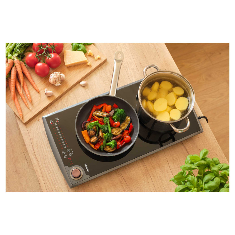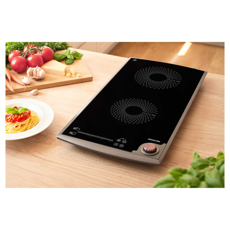 Індукційна плита Sencor SCP 5414GY з двома конфорками забезпечує ефективне приготування завдяки потужності 3100 Вт. Комбінація сенсорного та механічного керування спрощує роботу, а десять рівнів температури дозволяють точно регулювати нагрівання. Таймер надає змогу встановлювати час приготування до трьох годин. Компактна конструкція зручно розміщується навіть у невеликому просторі.