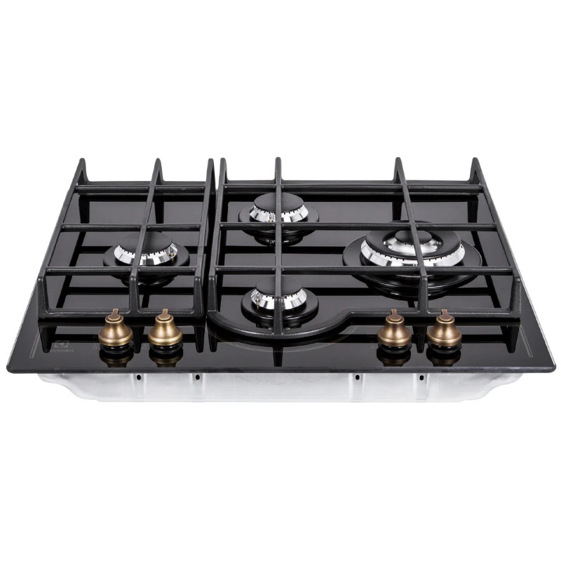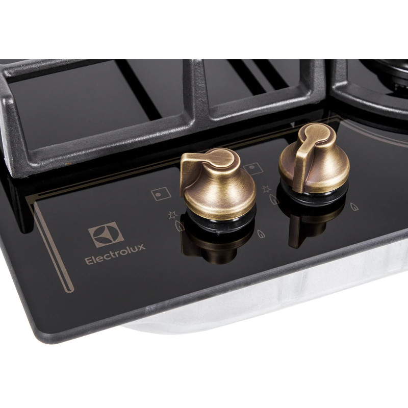Газова варильна поверхня Electrolux Rococo на склі поєднує класичний дизайн і сучасні функції. Скляна робоча зона в чорному кольорі створює стриманий вигляд кухні. Чавунні тримачі забезпечують стабільне розміщення посуду. Інтегроване електрозапалювання активується поворотом регулятора. Газ-контроль автоматично припиняє подавання газу за відсутності полум’я.
