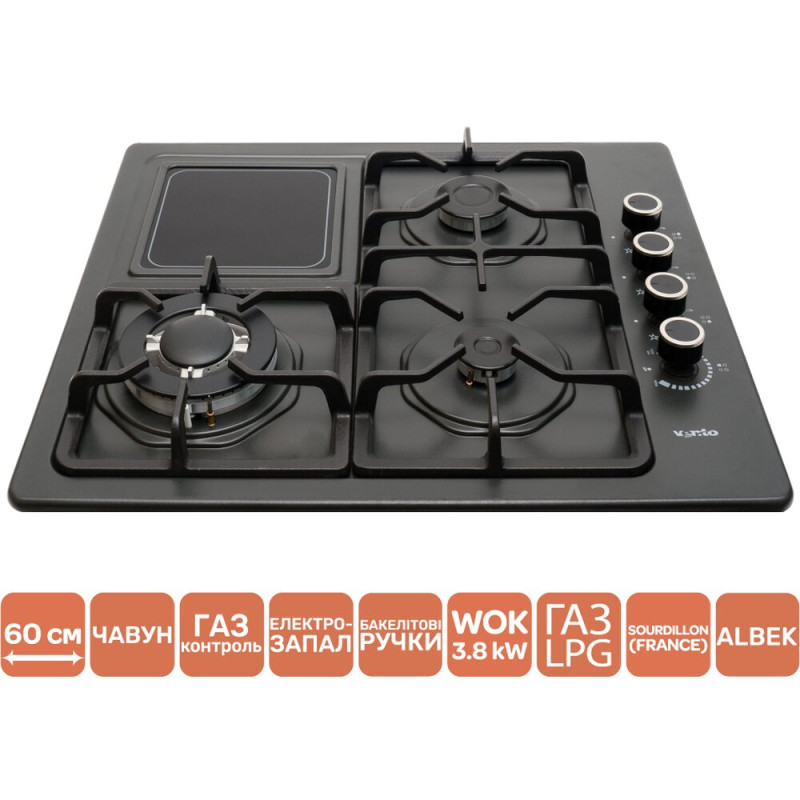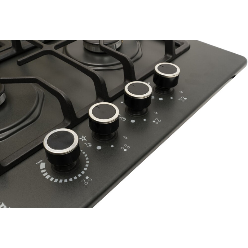 | Особливості | конфорки SABAF (Made in Italy), загартоване скло 8 мм, ручки управління з високоякісного жаростійкого матеріалу, 3 мм розсікачі, жиклери Sourdillon (Made in France), може працювати без електроенергії |
