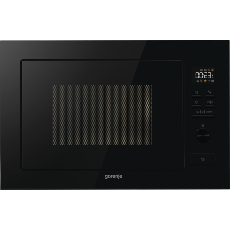 Gorenje BM251M2BG — вбудована мікрохвильова піч об’ємом 25 л з потужністю мікрохвиль 900 Вт, грилем та 8 автоматичними програмами. Електронне управління з дисплеєм, 5 рівнів потужності, функція розморожування за вагою/часом, система «капля-стоп». Внутрішня камера з нержавіючої сталі, поворотна тарілка 315 мм, блокування від дітей. Підходить для щоденного використання в кухнях з обмеженим простором. Колір — чорний, сучасний дизайн з імітацією скла на панелі.