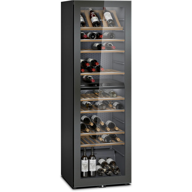 Окремовстановлювана винна шафа Siemens KW36KATGA створена для стабільного зберігання великої колекції вина. Дві температурні зони підтримують діапазон від 7 °C до 19 °C, що дозволяє розділяти різні типи напоїв. Об’єм 370 літрів вміщує до 199 пляшок. Інтегрований вентилятор забезпечує рівномірне охолодження, а низький рівень шуму 38 дБ не відволікає у житловому просторі. Чорний корпус із дизайном High Door формує стриманий сучасний вигляд.