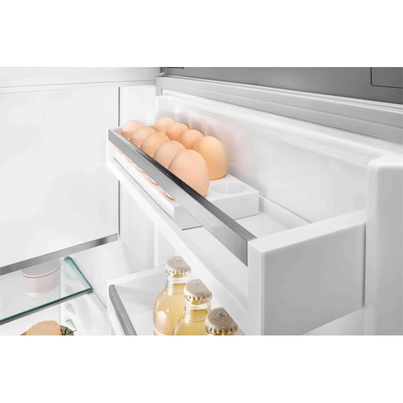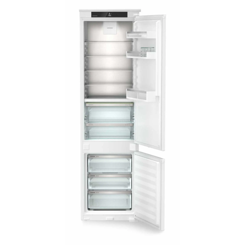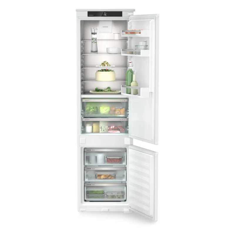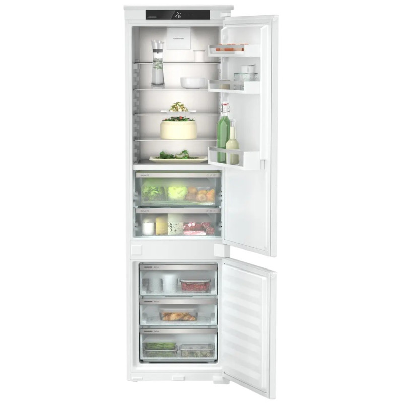 Вбудований двокамерний холодильник Liebherr із нижнім розташуванням морозильної камери поєднує систему BioFresh для тривалого збереження свіжості продуктів, технологію NoFrost у морозильнику та незалежні контури DuoCooling. Регульовані полиці, розкладна скляна панель, місткі відділення в дверцятах і ящики FrostSafe забезпечують комфортну організацію простору. Тиха робота, LED-освітлення та можливість встановлення SmartDeviceBox роблять модель зручною для сучасного дому.