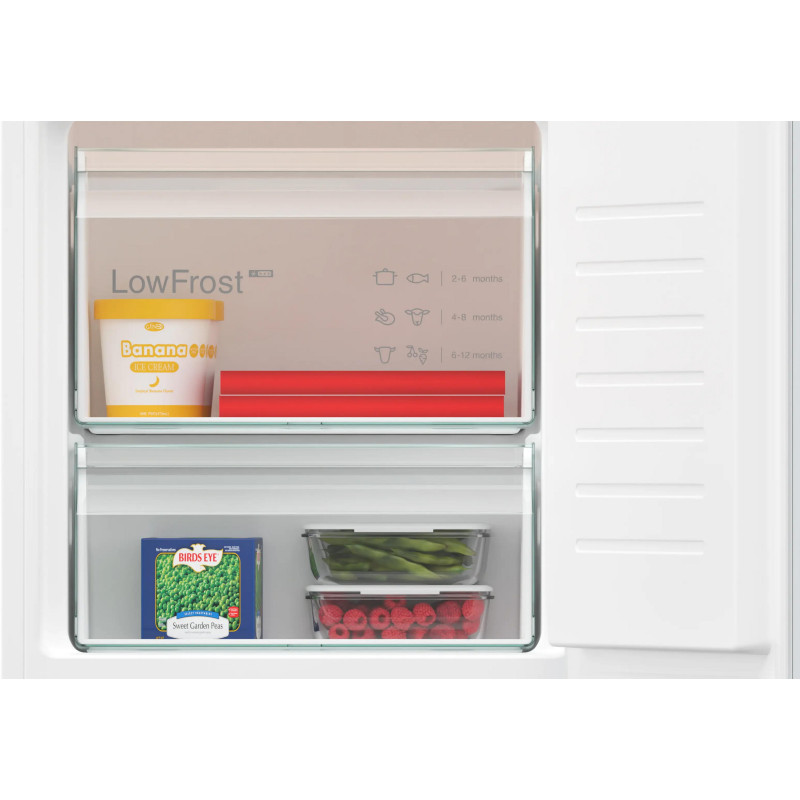 Вбудовуваний холодильник Siemens KI87VVSE0N із нижньою морозильною камерою поєднує раціональне використання простору та стабільну роботу. Холодильне відділення об’ємом 200 л доповнене морозильним на 70 л. Контейнер hyperFresh підтримує свіжість овочів і фруктів упродовж тривалішого часу. LED-освітлення рівномірно висвітлює внутрішній простір. Конструкція з ковзним шарніром забезпечує коректну інтеграцію в кухонні меблі.