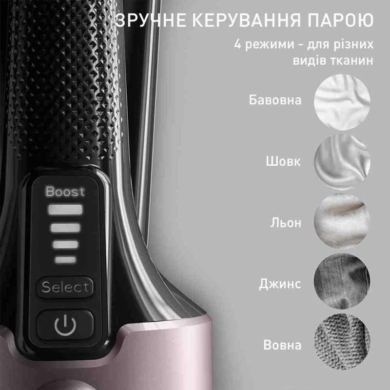 | Особливості | Резервуар для води: Знімний; Використання: Вертикальне + Горизонтальне; Час нагрівання: 25 секунд; Легке перемикання між горизонтальним і вертикальним режимами; Блискавичний час нагрівання; Експертне розгладження складок; Легке наповнення резервуара та тр |