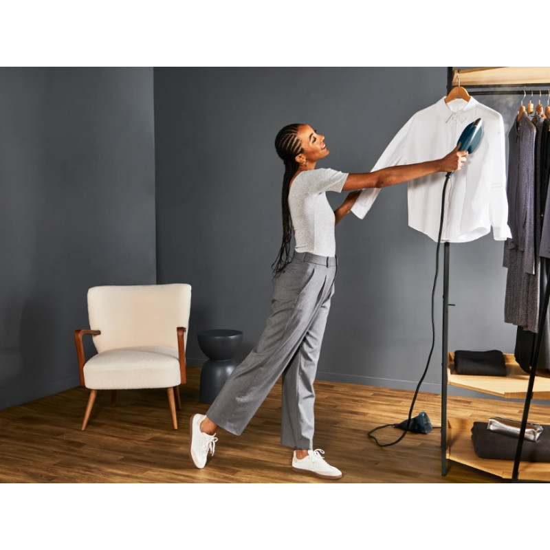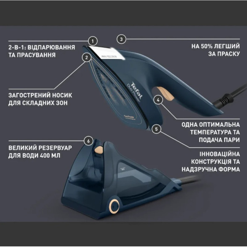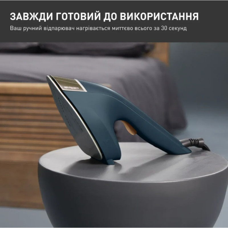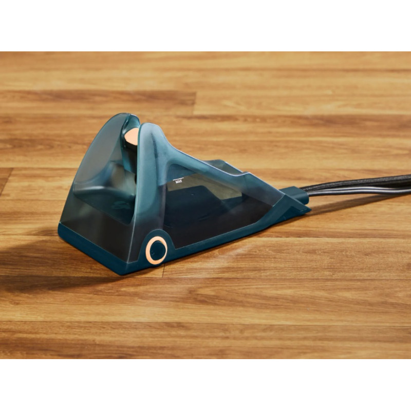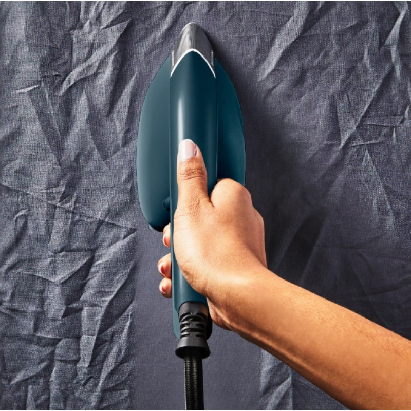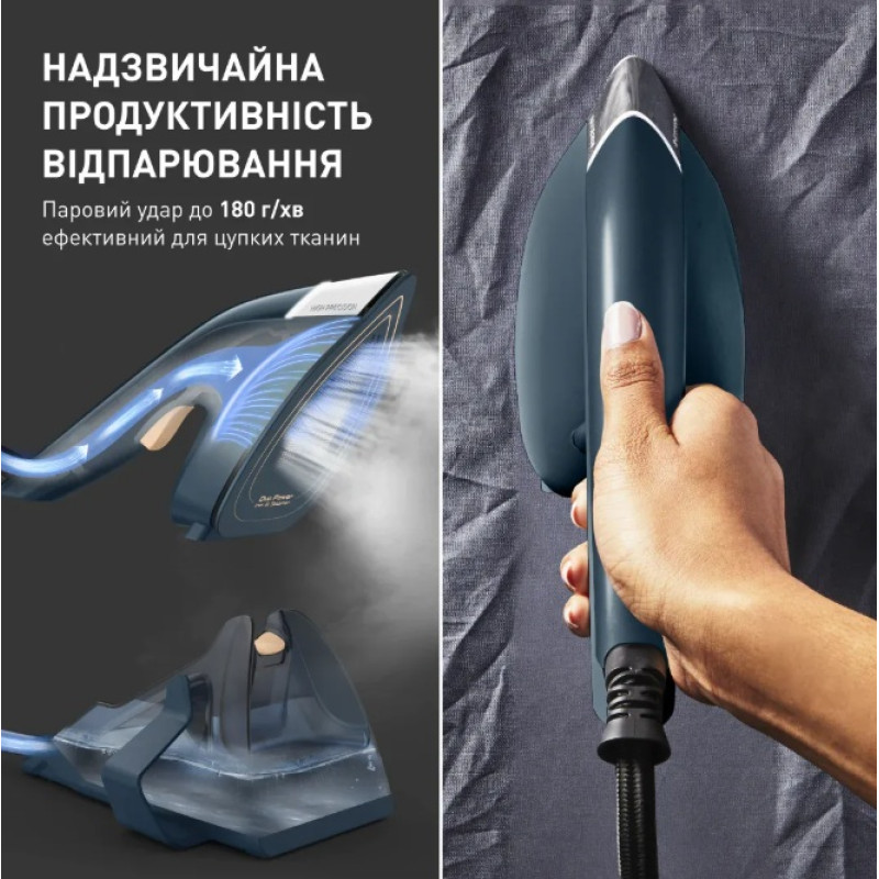 | Особливості | Час нагрівання: 30 секунд Підсвітка кнопки ввімкнення/вимкнення Резервуар для води Вага ручної частини 750 г за рахунок винесеного окремо резервуара для води Оптимальна температура підошви підходить для всіх типів тканин |