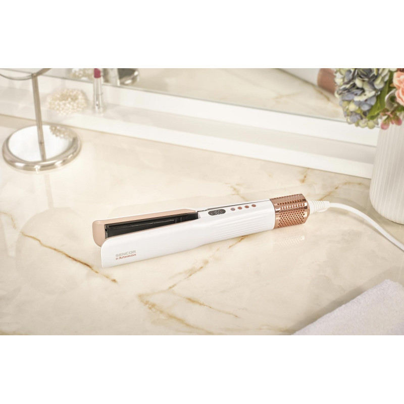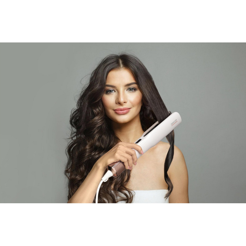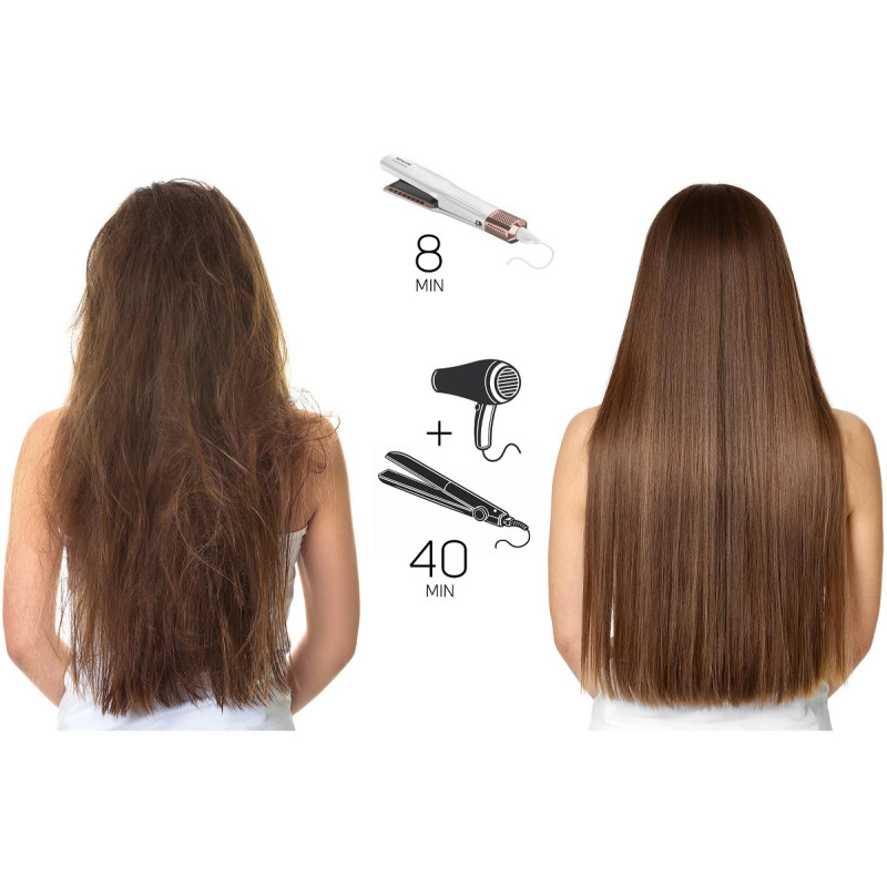 - Без гарячих пластин – потужний повітряний потік одночасно сушить і випрямляє волосся без пошкоджень