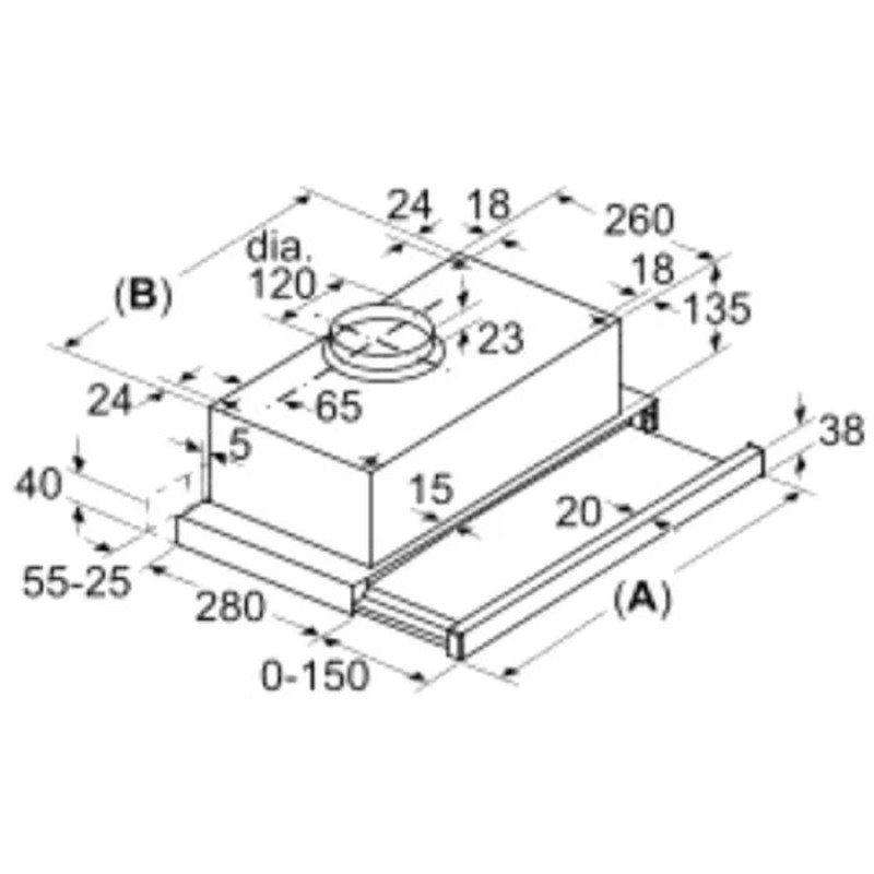 Bosch DFT63CA51T — компактна телескопічна витяжка Serie 2 шириною 60 см у сріблястому металік. Забезпечує продуктивність до 310 м³/год в режимі відведення та 220 м³/год у режимі рециркуляції. Просте механічне кнопкове керування, 3 швидкості, мийний алюмінієвий касетний фільтр та два LED-світильники потужністю 8 Вт. Ідеальне рішення для невеликих та середніх кухонь з обмеженим простором над плитою.