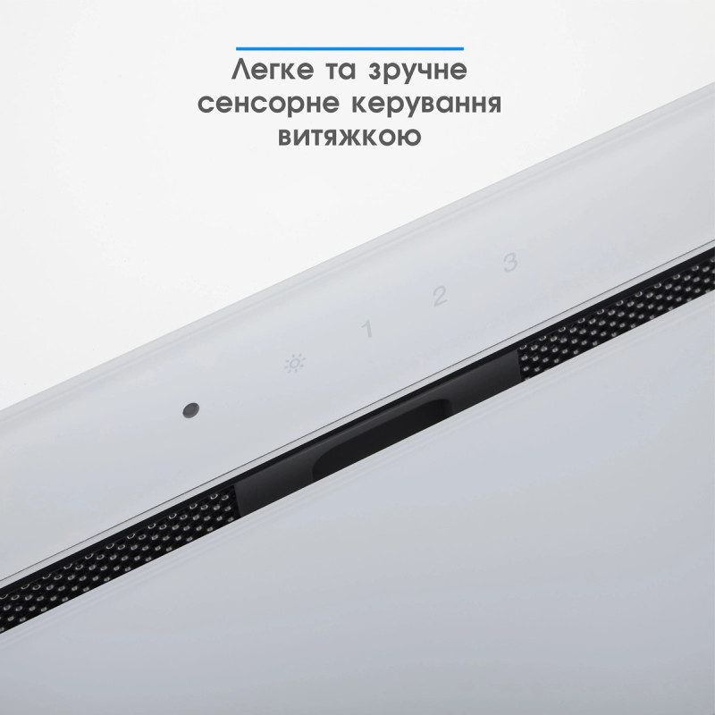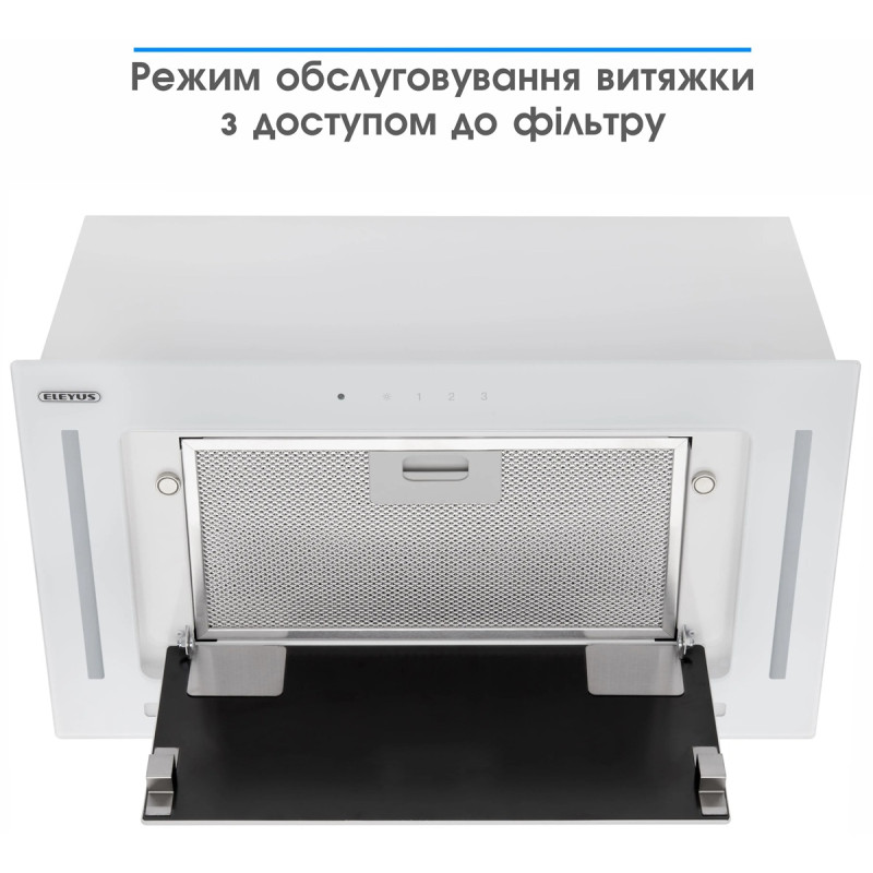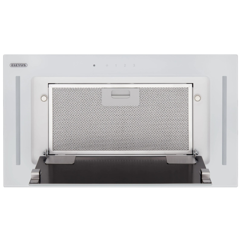 Витяжка повністю монтується в кухонну шафу шириною 60 см. Видимою залишається частина, виготовлена з міцного та красивого гартованого скла. Її гладенька поверхня створена для легкого очищення, а елегантний дизайн гармонійно доповнить інтер’єр вашої кухні.