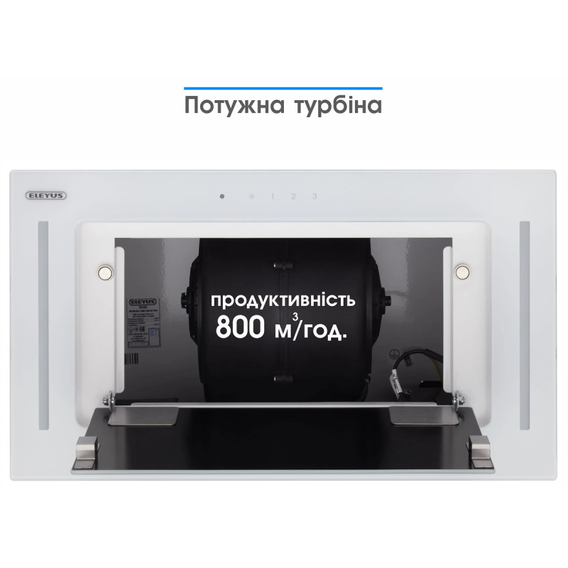 Турбіна продуктивністю 800 м³/год впорається з усім зайвим у кухні площею до 19 м². Периметральне втягування забирає повітря навколо всього фільтра і легко впорається із зайвими запахами та випарами.