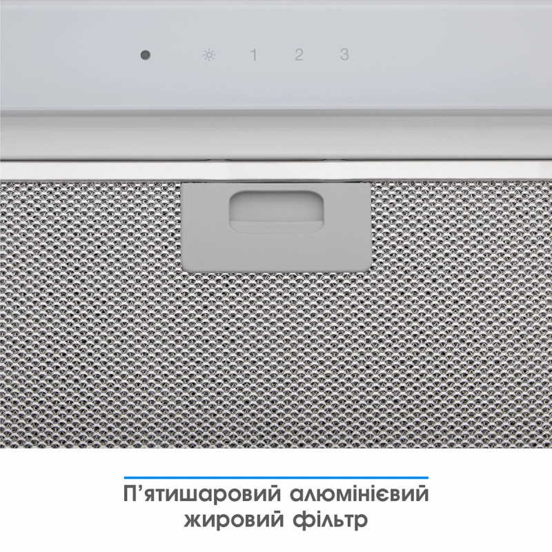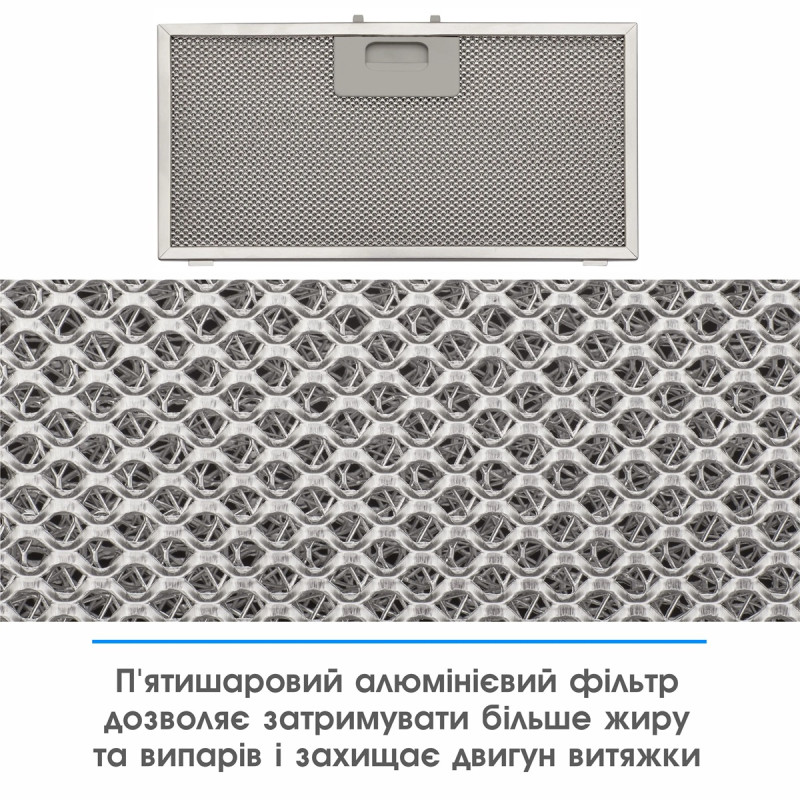 Надійний 5-шаровий алюмінієвий фільтр поглинає жир, бруд, дрібні сторонні частинки та захищає двигун витяжки. Для легкого очищення його достатньо вийняти та помити в гарячій воді чи посудомийній машині.