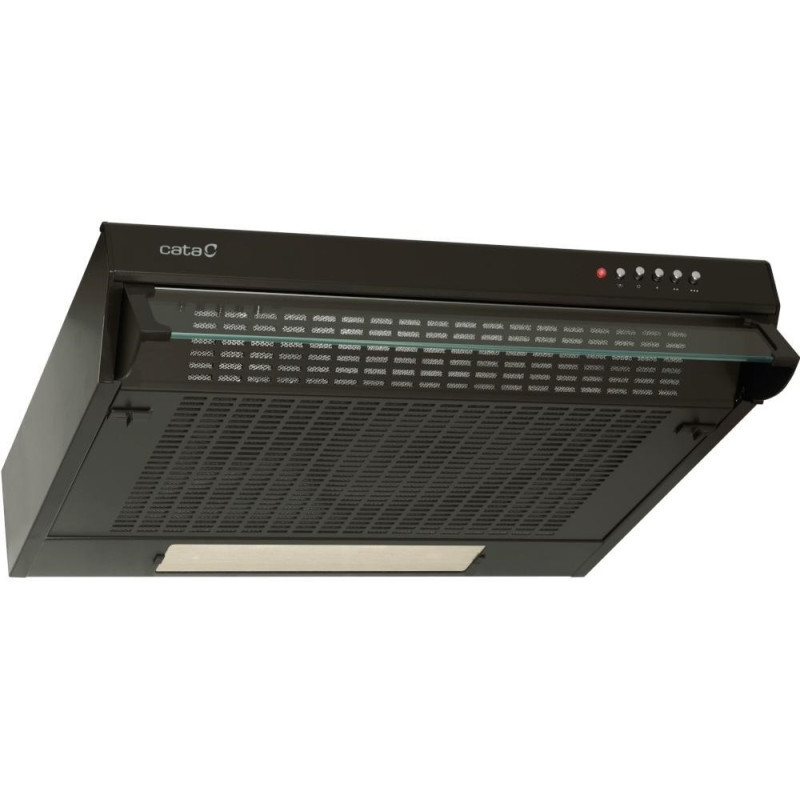 Cata LF 2060 BK (02011407) — плоска витяжка шириною 60 см у чорному корпусі. Продуктивність до 350 м³/год, 3 рівні потужності, механічне повзункове керування, металевий фільтр, галогенне освітлення. Працює в режимі відведення або рециркуляції, мінімальна відстань до плити 650 мм. Бюджетне рішення для невеликих і середніх кухонь з класичним дизайном.