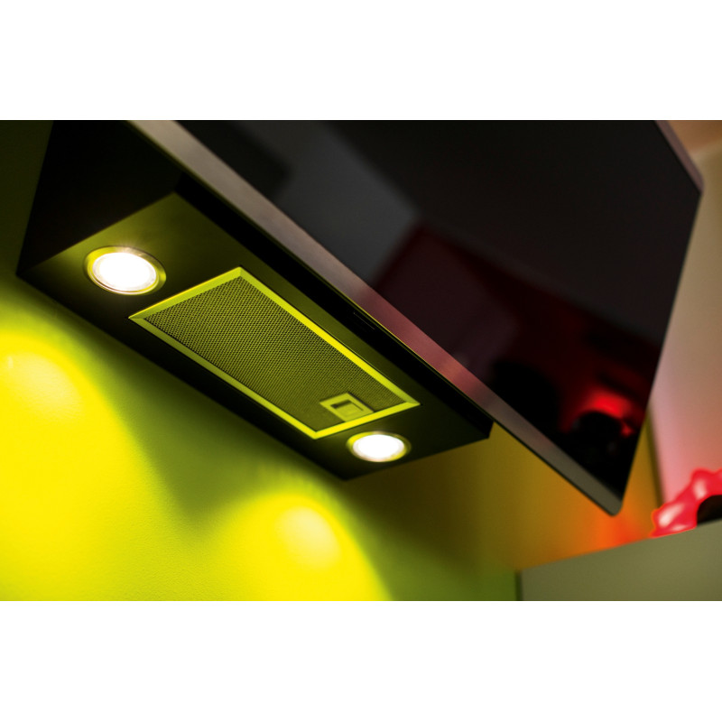 Чорне скло в поєднанні з смужками з нержавіючої сталі роблять витяжку надзвичайно елегантною, а також сумісна з духовками серії Smart Plus. Сучасний енергоефективний мотор забезпечує продуктивність до 1202 м3 / ч при цьому відповідає класу енергозбереження А. LED лампи потужністю всього 1 Вт забезпечать відмінне підсвічування варильній поверхні і економію електроенергії.