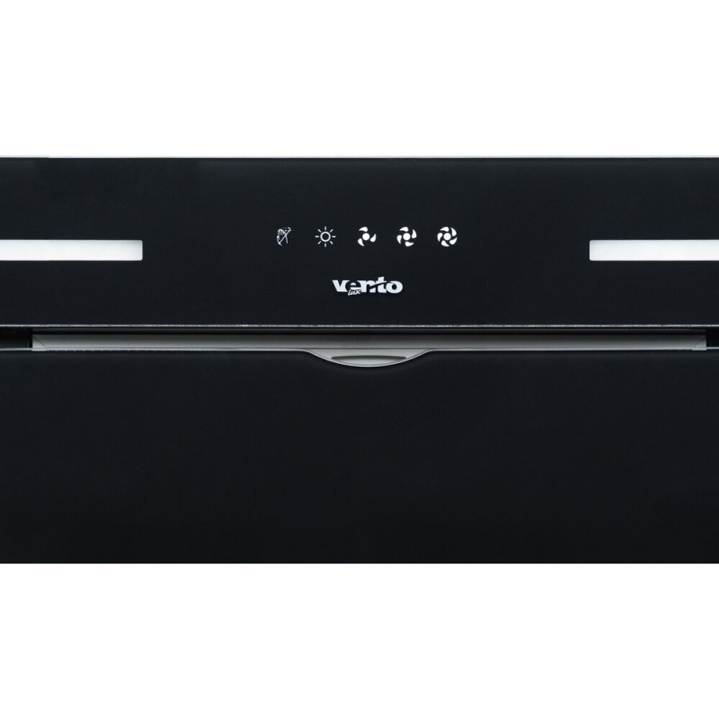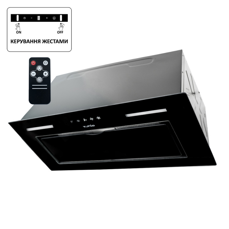 Модель PUNTO 520/279 BGG (1000) MS монтується в кухонну шафку шляхом врізання в її дно, таким чином ви будете бачити лише її низ повністю чорного кольору. На склі розташовуються сенсорні кнопки, також керувати витяжкою можна ще двома способами – помахами рук (жестами) та пультом дистанційного управління.