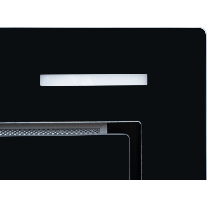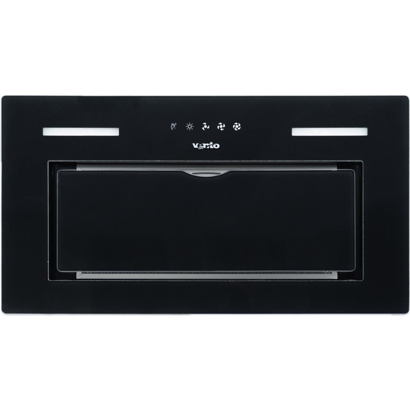 Відмінність цієї моделі також в розташуванні світильників – спереду на передній панелі, як результат, маємо більш ефективне освітлення зони під витяжкою. Нижня частина витяжки повністю чорного кольору, адже чорний скляний люк закриває фільтра для вловлювання жиру.