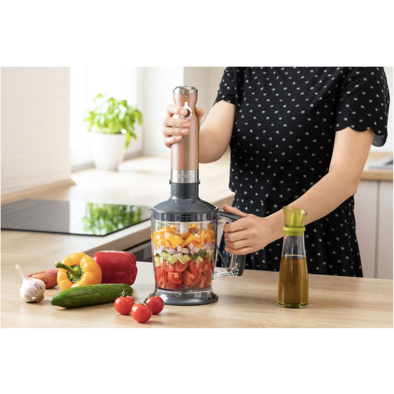 Ручний блендер з універсальними функціями що дозволять по максимуму заощадити час і місце на кухні. Потужність мотора в 1200 Вт забезпечує чудові результати, як то змішування, збивання чи подрібнення. Крім того, у вас є вибір із дев’яти колірних варіацій, які створюють красиві металеві кольори.