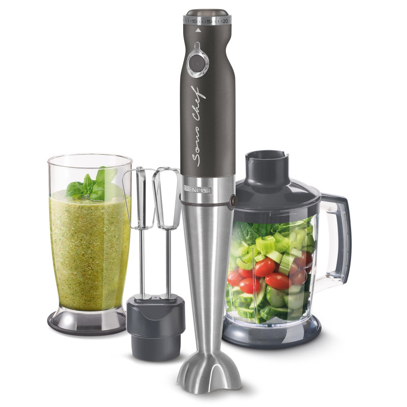 Занурювальний блендер з універсальними функціями, які дозволяють по максимуму заощадити час і місце на кухні. Потужності мотора в 1200 Вт достатньо для змішування, збивання чи подрібнення.