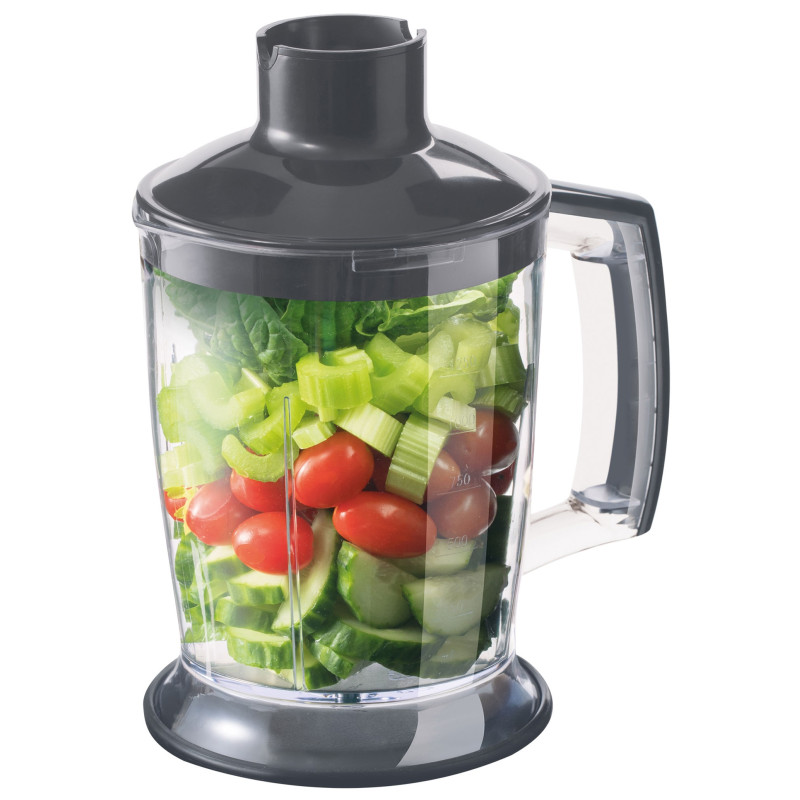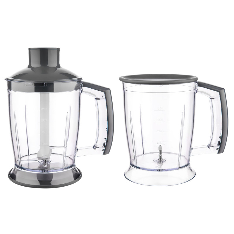 | Комплектація | Аксесуари: Чаша для змішування ємністю 800 мл, з кришкою Нержавіюча насадка для збивання з двома вінчиками Ємність для подрібнення об'ємом 1 250 мл з лезами з нержавіючої сталі Кнопки для розблокування знімної насадки |