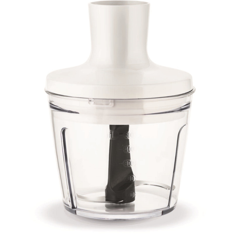 Чаша для подрібнення об'ємом 500 мл за рахунок специфічної конусної форми та розташованого під кутом дволопатевого ножа позбавляє необхідності нарізати продукти вручну. З нею можна швидко та без проблем подрібнити та порубати будь-які овочі, фрукти, м'ясо, рибу, сир, горіхи і зелень, а також приготувати різноманітні соуси, коктейлі, фарші та інші страви, і заготовки. Усі змінні аксесуари придатні для миття в посудомийній машині (крім елементів з приводом).