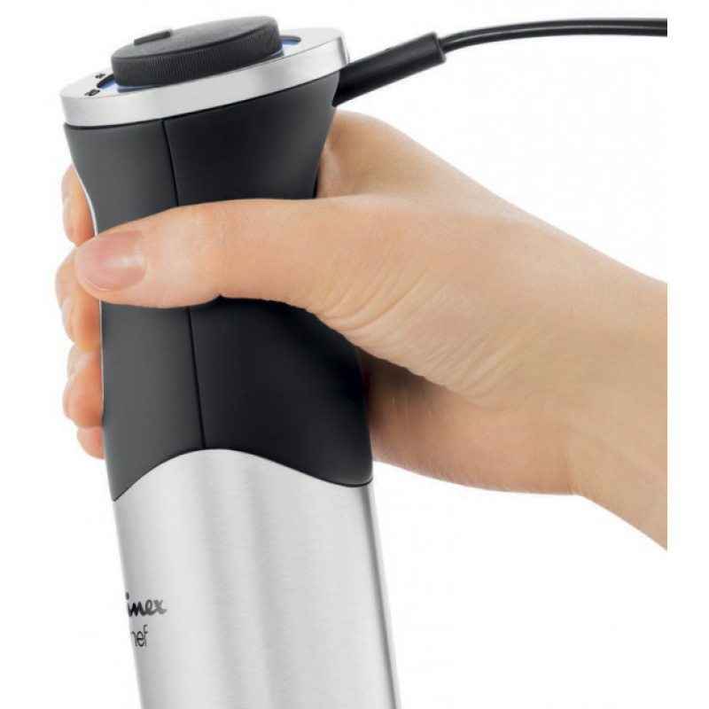 Зручний у повсякденному використанні занурювальний блендер Tefal HB656838 здатний значно полегшити вам життя, так як з його допомогою ви зможете втілити свої задумки при створенні кулінарних шедеврів, які гідно будуть оцінені як рідними, так і близькими друзями. Варто відзначити, що дана модель чудово справляється зі збиванням і подрібненням різних овочів, фруктів і м'яса, що дозволить вам приготувати смачні супи, соуси та інші страви. А скориставшись вінчиком, вам будуть під силу навіть найніжніші креми. Крім цього, мірна склянка об'ємом 0,8 л і чаша на 0,5 л виготовлені з міцного харчового пластику, який безпечний для здоров'я, при цьому вибрані продукти не мають стороннього запаху та присмаку. Потужності 1000 Вт і наявності 20 швидкостей досить, щоб впоратися з різними продуктами та домогтися необхідних результатів, а для твердіших інгредієнтів можна скористатися передбаченим турборежимом або імпульсним режимом для отримання ніжнішої консистенції. До переваг Tefal HB656838 також відноситься продумане антирозбризкування і підсвічування регулятора швидкості.