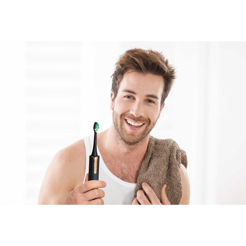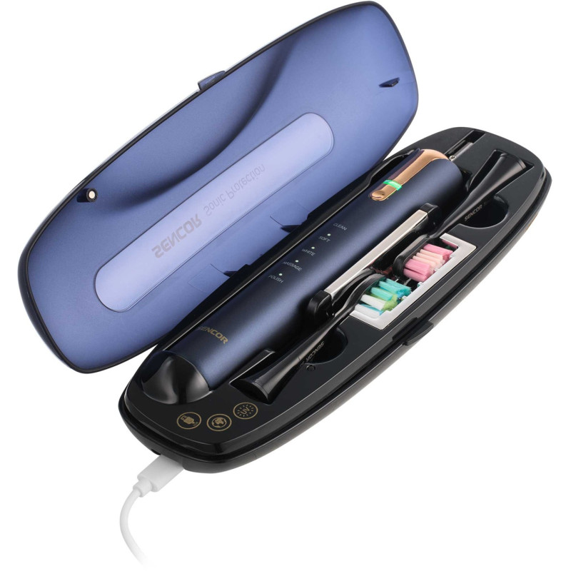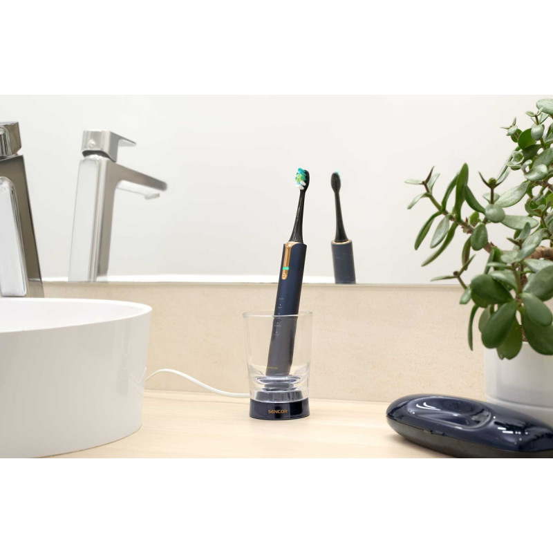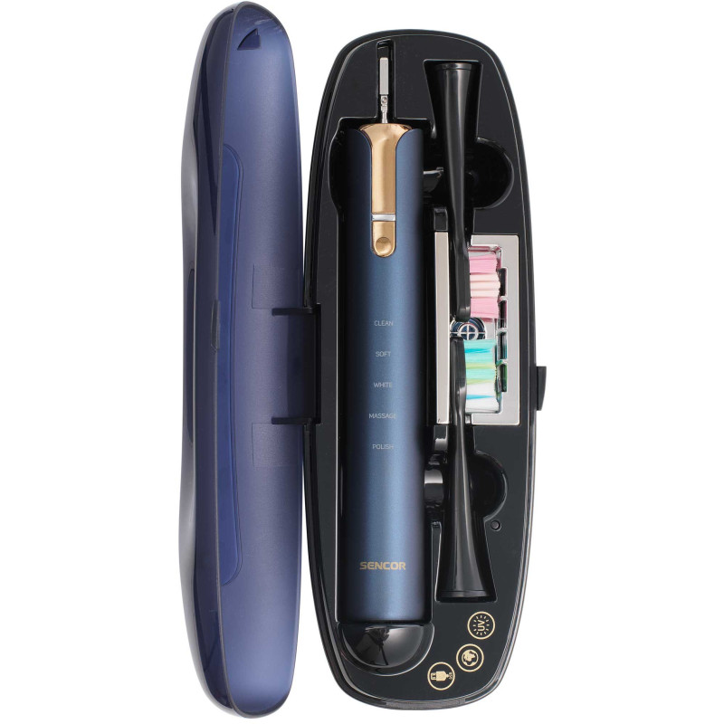 | Комплектація | Комплектація: 1 корпус щітки, 2 головки, 1 індукційний зарядний пристрій, 1 склянка, 1 дорожній футляр з USB-конектором і УФ-стерилізатором Футляр: Містить 1 корпус щітки, 2 чистячі головки або 1 чистячу головку і 1 зубну пасту |