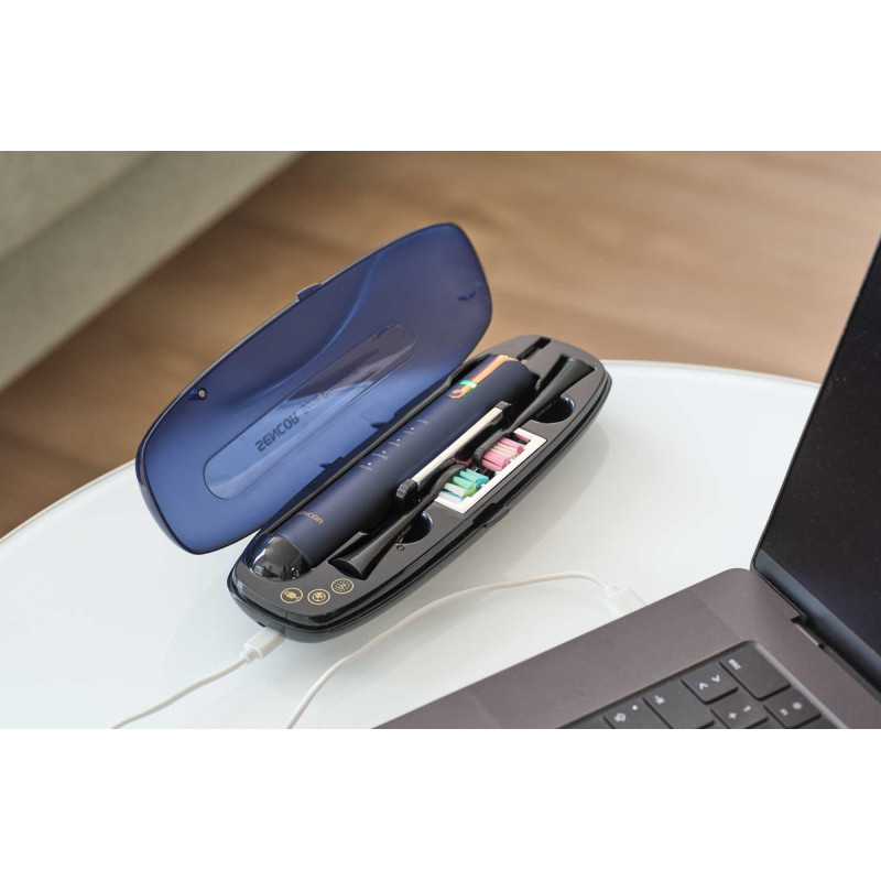 - Комплектація: 1 корпус щітки, 2 головки, 1 індукційний зарядний пристрій, 1 склянка, 1 дорожній футляр з USB-конектором і УФ-стерилізатором