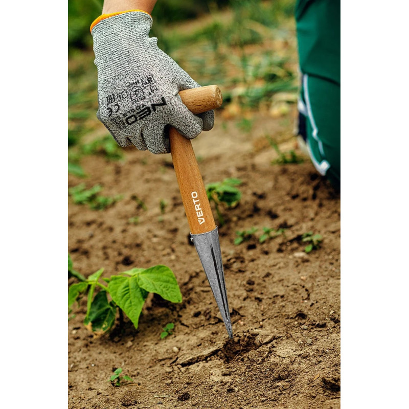 Інструмент для посадки розсади15G425 від VERTO - незамінний помічник для викопування отворів під насіння та розсаду. Рукоятка з Т-подібним держаком виготовлена з деревини бука. Шампур довжиною 125 мм виготовлений з оцинкованої сталі А3 для забезпечення стійкості до корозії і, таким чином, тривалого терміну служби. Загальна довжина кирки разом з ручкою становить 275 мм.