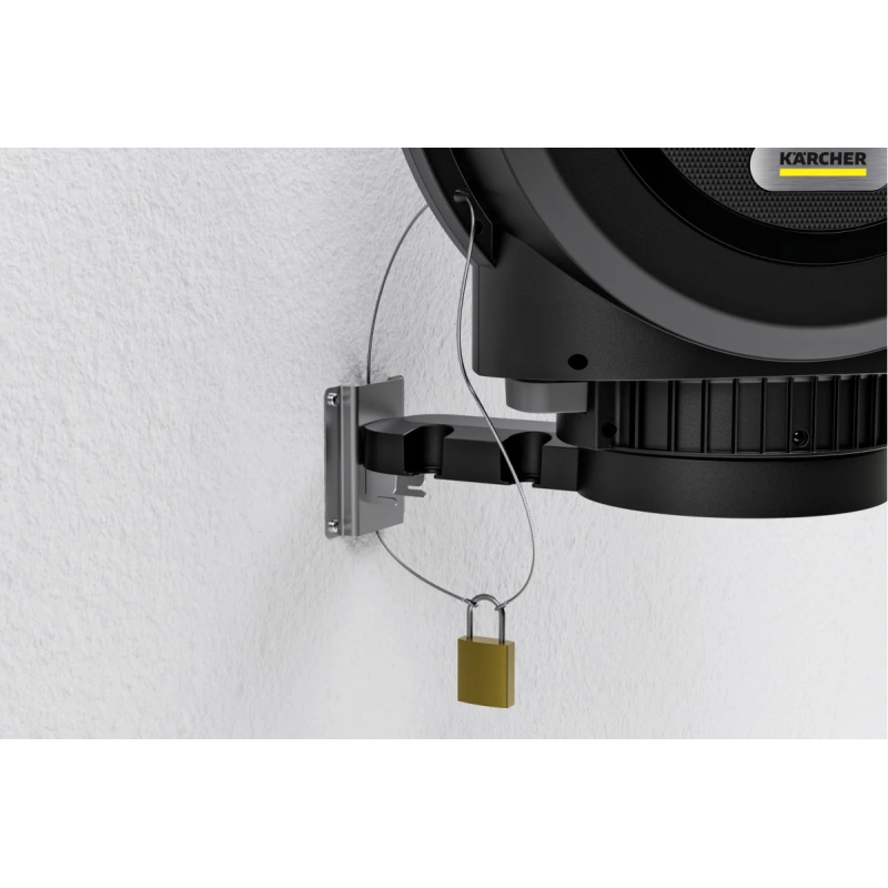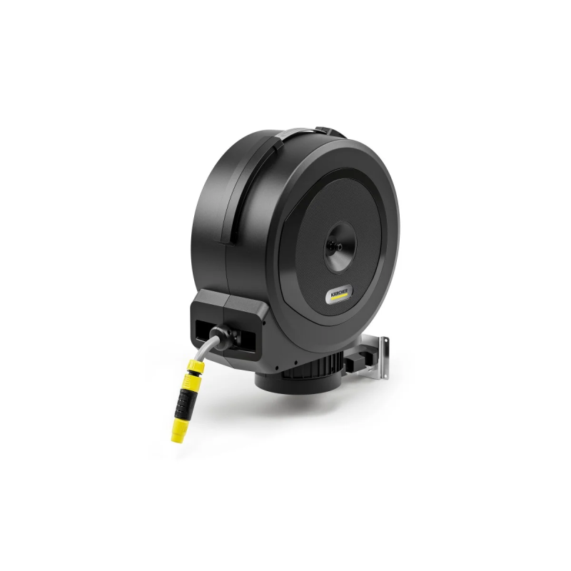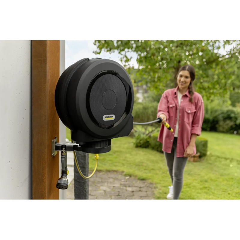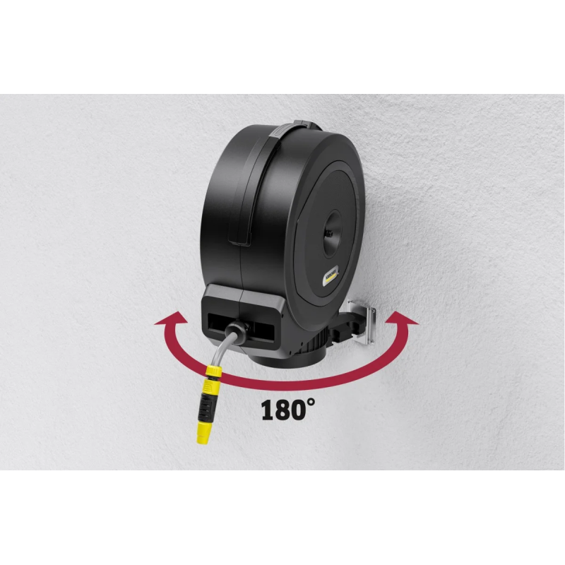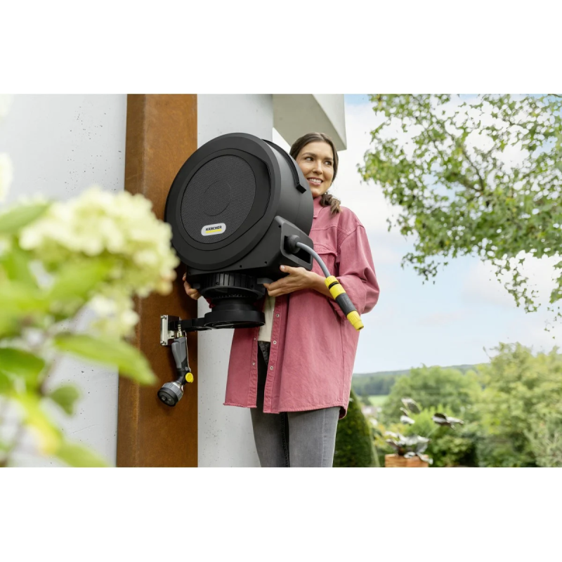 Автоматична котушка Kärcher HBX 5.35 забезпечує зручне зберігання та використання 35-метрового шланга 1/2". Потягнувши за кінець шланга, ви отримуєте потрібну довжину — він фіксується в будь-якому положенні. Для змотування достатньо легкого ривка — шланг акуратно намотується самостійно без перегинів і вузлів. Котушка поворачується на 180° і легко знімається зі стіни завдяки системі FlexChange. Міцні матеріали та морозостійкість дозволяють залишати її на стіні цілий рік.