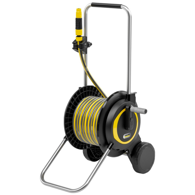 Міцний візок для шланга Karcher дає змогу зберігати садовий шланг з економією місця і дуже зручний у застосуванні. Акуратне змотування шланга забезпечується ергономічною кривошипною рукояткою. Візок оснащений дуже широкою опорою, що гарантує високу стійкість, і практичним тримачем для розпилювача на ручці для переміщення. Він стійкий до впливу морозу та УФ-випромінювання. У комплект поставки включені шланг довжиною 20 м, розпилювач та інші аксесуари для поливу. Завдяки інноваційним швидкодіючим затискачам телескопічна ручка візка легко встановлюється на необхідній висоті або повністю зсувається вниз. Karcher надає на візок 5-річну гарантію. Він поставляється в змонтованому стані.