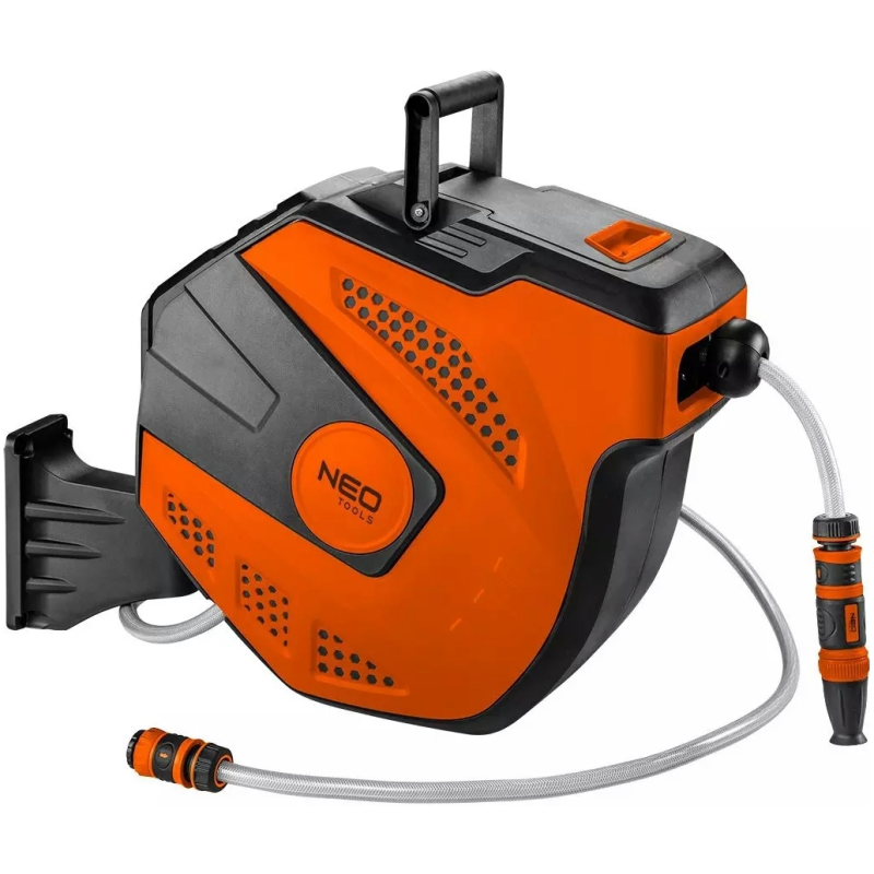 Автоматичне намотування шланга 15-891 NEO - це повний комплект не тільки для поливу саду. До 20 м шланга з додатковими 2 м сполучного шланга. Набір укомплектований автоматичним пристроєм, що втягує, і зрошувачем. Крім того, він має штуцер та муфти. Зручна система автоматичного втягування шланга має гальмівний механізм, що запобігає неконтрольованому пошкодженню наконечника. Шланг також можна зафіксувати на будь-якій довжині, що запобігає складкам і перегинам шланга завдяки системі напрямних, захищаючи його від пошкоджень.