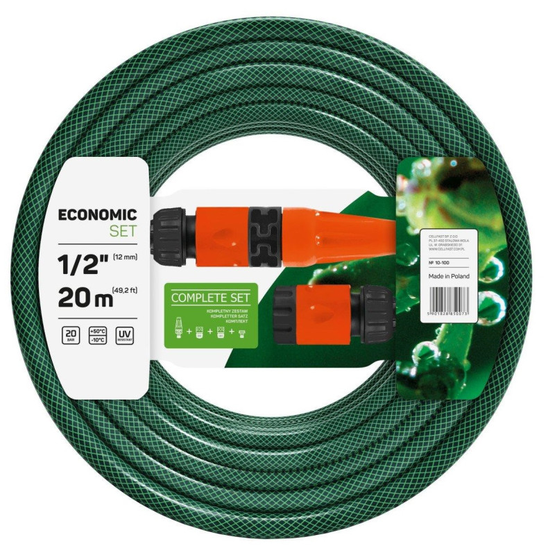Набір для поливу Cellfast ECONOMIC 1/2", 20м з зрошувачем та комплектом для підключення, шланг 3-х шаровий, -10…+50°C 10-100. Шланг має: 3-шарову конструкцію, поліестерове хрестоподібне обплетення, високу еластичність. Завдяки спеціальним внутрішнім стінкам шланга, запобігає наростанню водоростей. Межі робочої температури становлять -10 / +50°С. Використовується для поливу саду та городу, а також транспортування води.