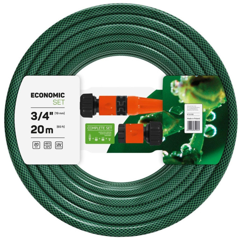Набір для поливу Cellfast ECONOMIC 3/4", 20м з зрошувачем та комплектом для підключення, шланг 3-х шаровий, -10…+50°C 10-102. Шланг має: 3-шарову конструкцію, поліестерове хрестоподібне обплетення, високу еластичність. Завдяки спеціальним внутрішнім стінкам шланга, запобігає наростанню водоростей. Межі робочої температури становлять -10 / +50°С. Використовується для поливу саду та городу, а також транспортування води.
