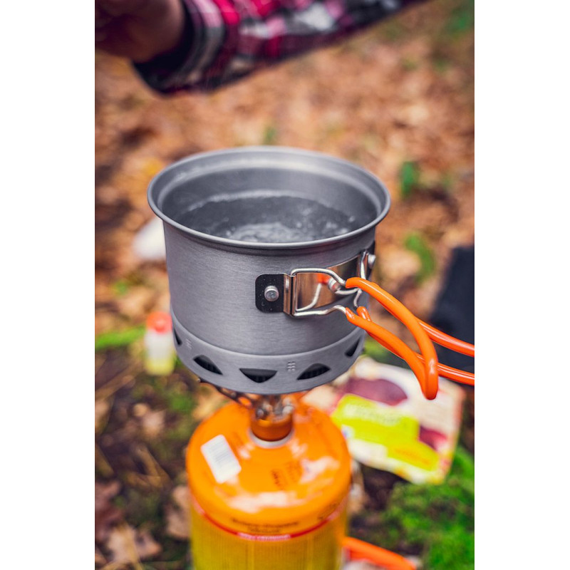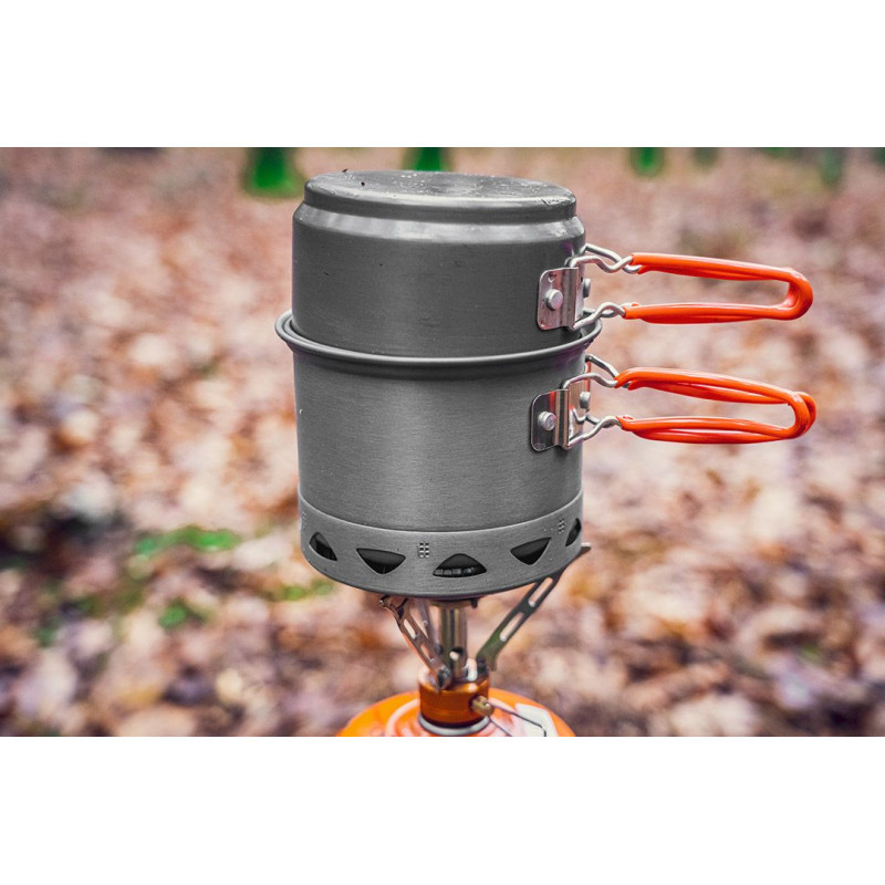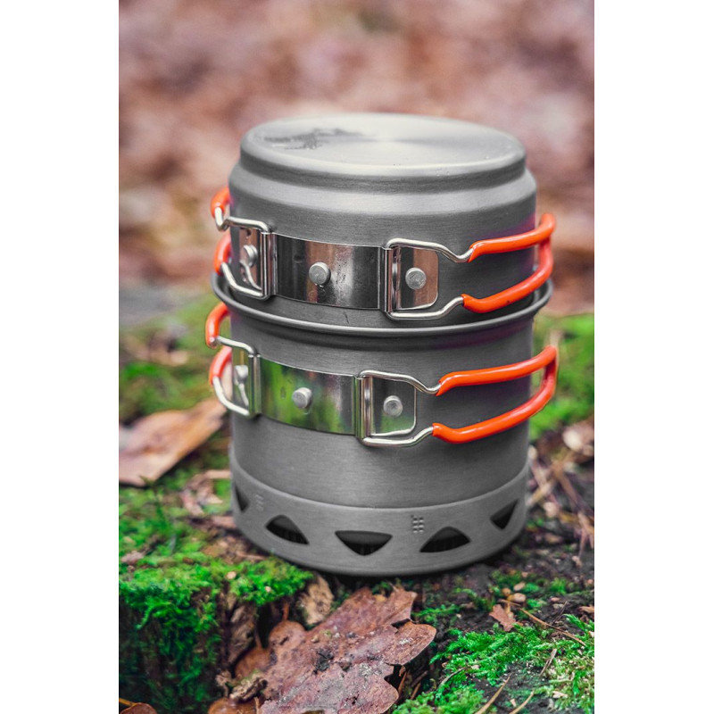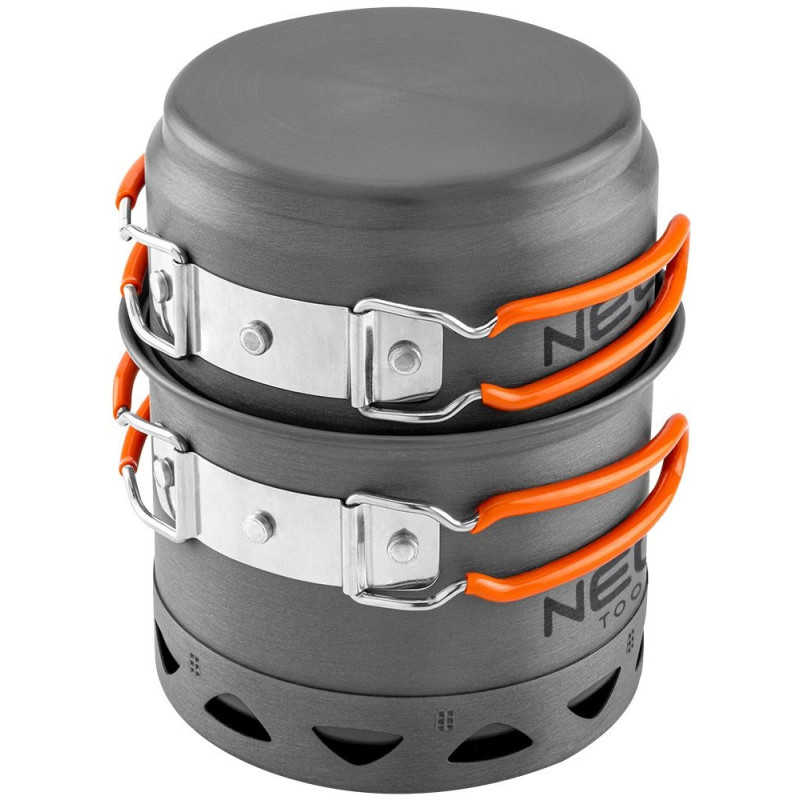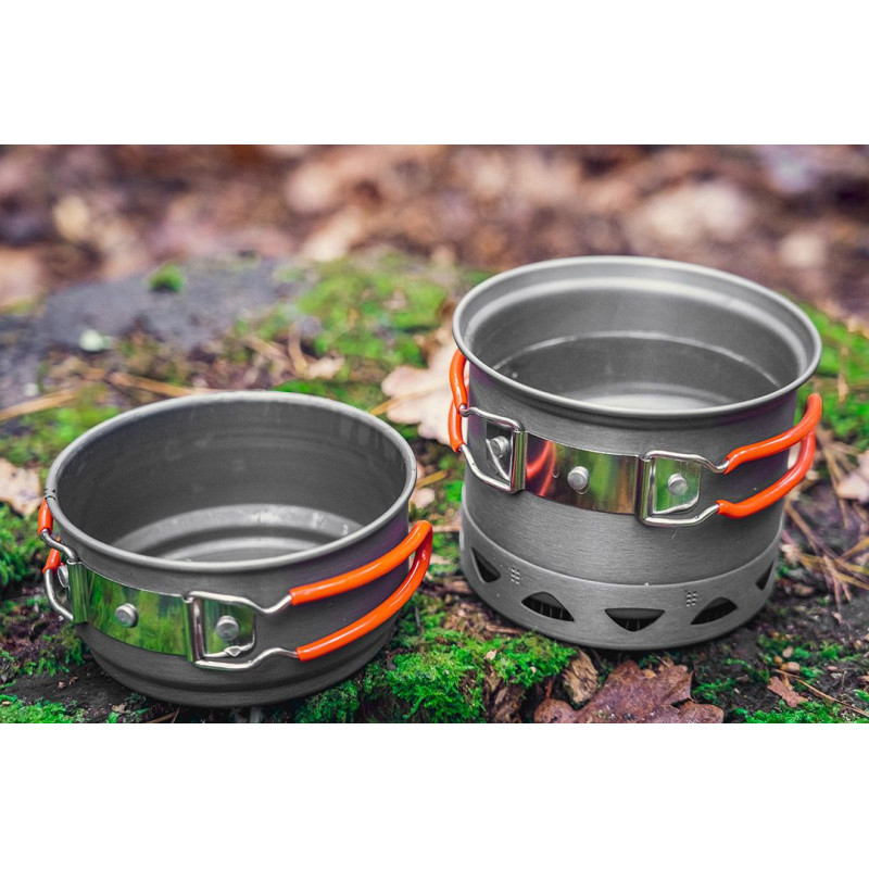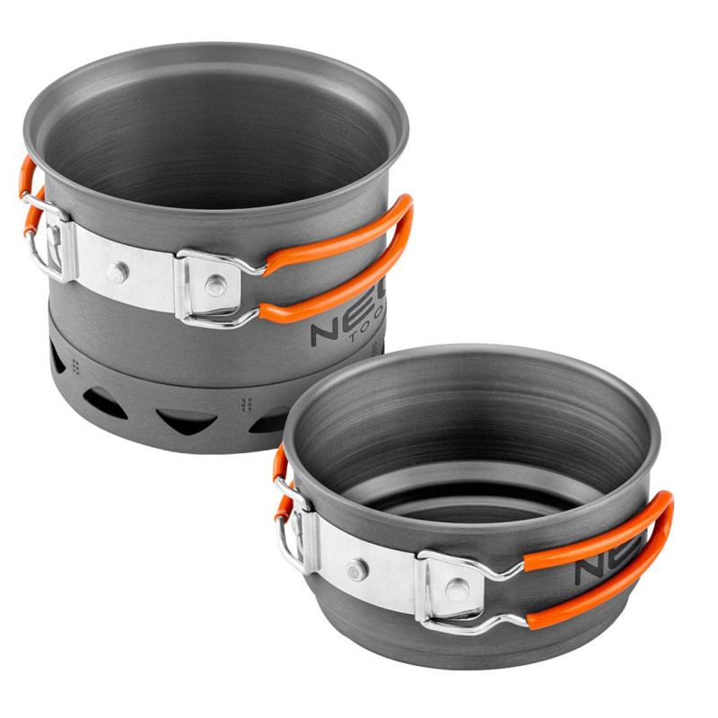 Набір каструль 2 в 1 з тепловідведенням 63-144 від NEO включає каструлю з тепловідведенням, що захищає її від вітру і збільшує функціональність на 30%, і практичну сковороду. Об'єм каструлі становить 0,9 літра, висота – 100 мм, діаметр – 132 мм. Ємність сковороди – 0,5 л, висота – 125 мм, діаметр – 60 мм. Компоненти виготовлені з анодованого алюмінію, що забезпечує високу міцність та малу вагу. Вага всього набору складає всього 268 г. Каструлі оснащені складними ізольованими ручками. Вони також мають діючий сертифікат LFGB про затвердження контакту з харчовими продуктами. Цей набір чудово підійде для поїздок за місто та походів. До нього додається практична дорожня сумка.