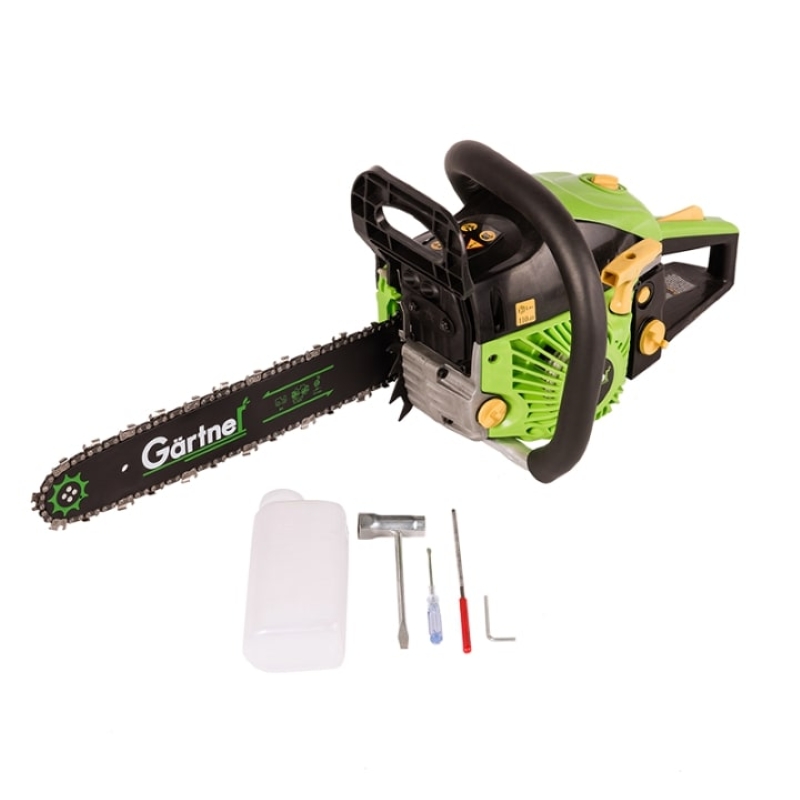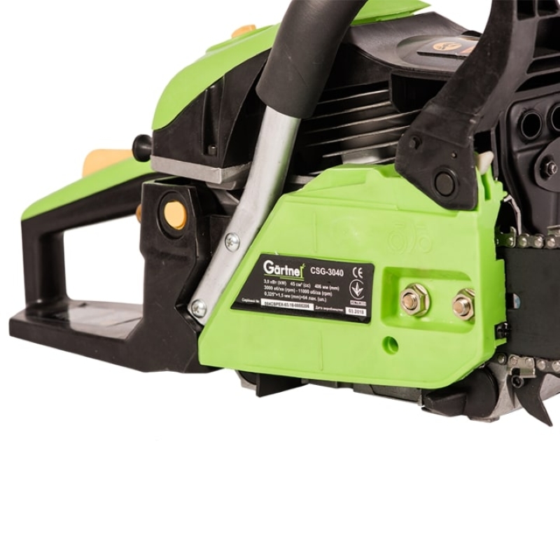 Пила бензинова Gartner CSG-3040 призначена для пиляння деревини. Оснащена двотактним двигуном із ручним стартером та системою легкого запуску. Має автоматичне змащення шини, гальмо ланцюга для безпеки та ефективне повітряне охолодження. Працює на паливній суміші бензину та мастила.