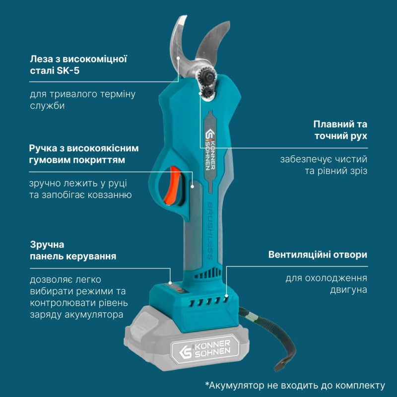 Секатор акумуляторний Konner&Sohnen KS CPS20V-32 20В d 15/25/35мм 0.82кг без АКБ та ЗП