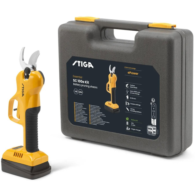 Акумуляторний секатор STIGA SC100eKit призначений для обрізання гілок, пагонів і плодових культур. Максимальний діаметр різу до 30 мм дозволяє працювати з більшістю садових завдань. Безщітковий двигун забезпечує стабільну роботу та точність зрізу. Три положення розкриття леза допомагають адаптувати інструмент до різного діаметра гілок. Комплект включає акумулятор, зарядний пристрій і кейс.