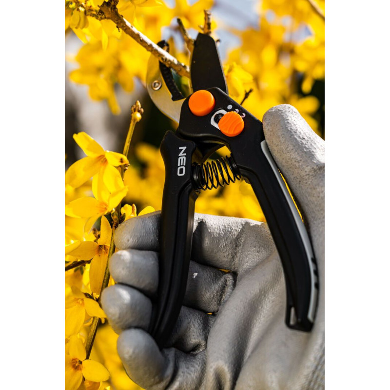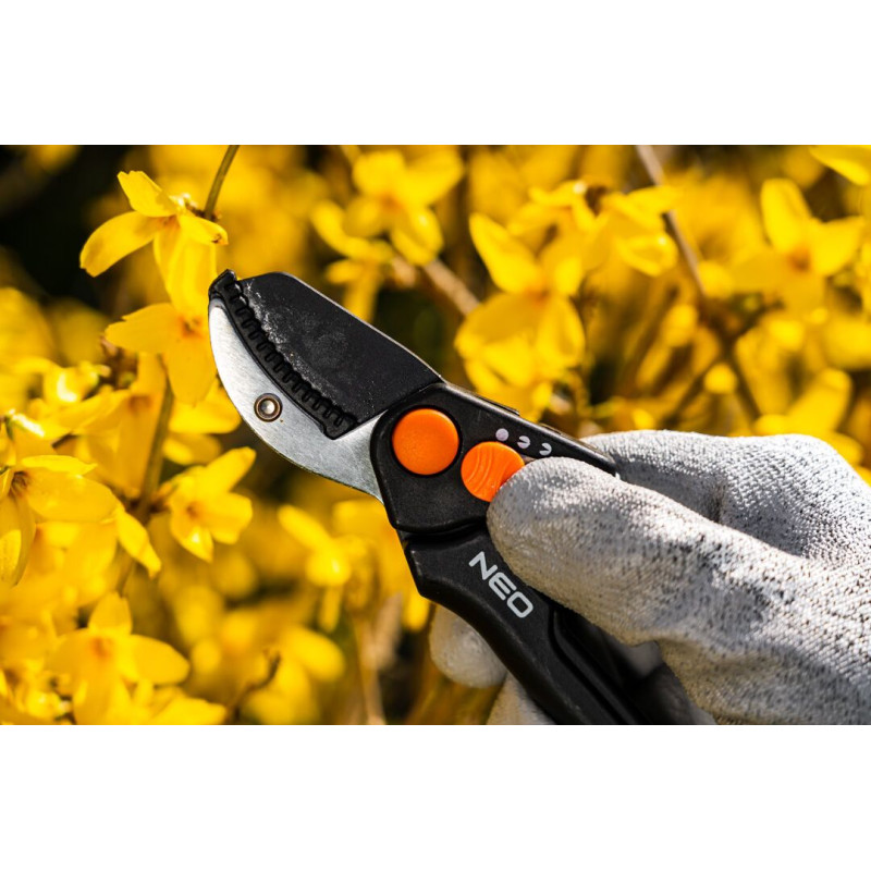 Секатор з ковадлом 185 мм, діапазон до 15 мм, регульований крок 15-201 NEO – незамінний інструмент для роботи в саду, полегшить сезонні роботи та перетворить кожну хвилину обов'язкового догляду за зеленню на задоволення.