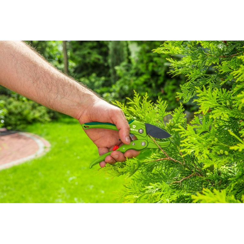 Секатор садовий з ковадлом VERTO (арт. 15G205) довжиною 190 мм і діаметром різання до 20 мм. Призначений для різання гілок. Леза вкриті тефлоновим покриттям, яке забезпечує захист від корозії. Блокада леза унеможливлює розкривання у небажані моменти. Секатор має западковий («храповий») механізм для полегшення різання. Ергономічне та легке руків’я зі скловолокна, вкрите протиковзним матеріалом, забезпечує безпеку та комфорт під час праці.