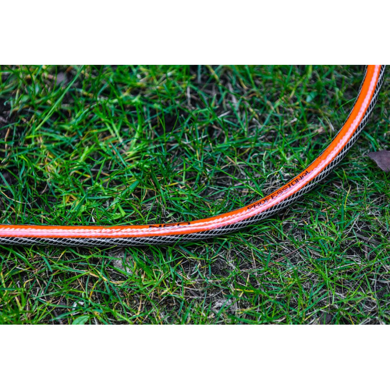 6-шаровий садовий шланг з гнучкого ПВХ, армований поліефірною ниткою, з двома обплетеннями (хрест і трико). Чудово підходить для догляду за малими і великими садовими ділянками, включаючи очищення вуличних меблів та інструментів, незалежно від пори року. Стійкий до накопичення водоростей і УФ-променів і придатний для контакту з харчовими продуктами завдяки шару Food Safe. Зручний у використанні завдяки системі проти скручування