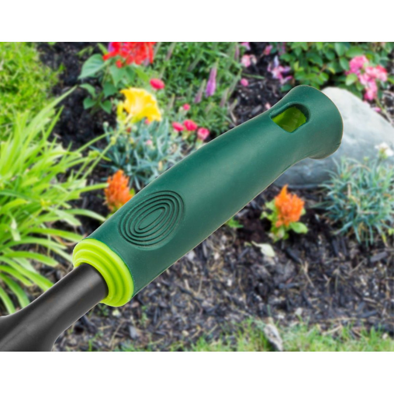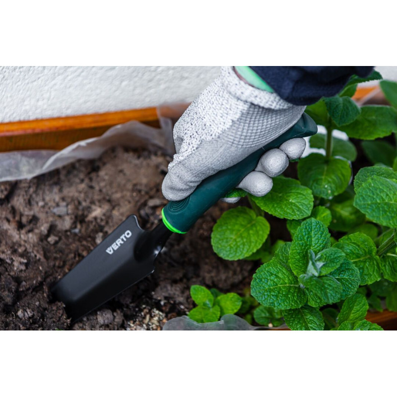 Лопатка VERTO (арт. 15G405) довжиною 340 мм. Дуже корисна під час садівничих робіт. Лезо виготовлене з міцної сталі, стійкої до деформацій. Гумована ручка ергономічної форми зручно міститься в долоні, не вислизаючи, що підвищує комфорт праці.