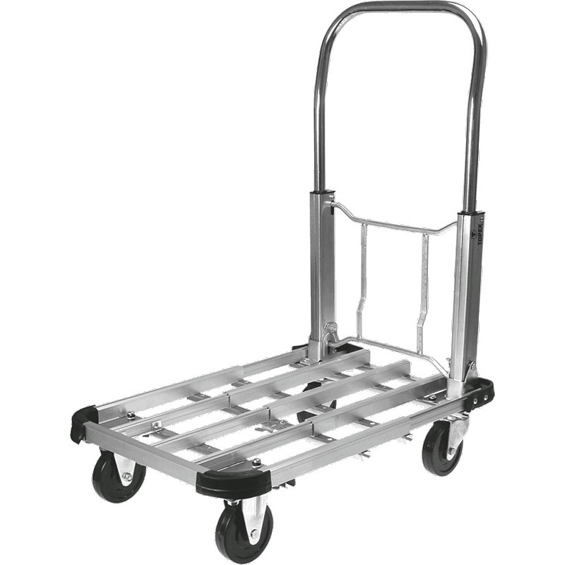 Візок вантажний складаний, платформний, TOPEX 79R300 це легкий і зручний візок з міцних алюмінієвих профілів, з регулюванням висоти ручки в діапазоні 50-70 см. Чотириколісний візок з платформою 70x42 см та вантажопідйомністю до 150 кг дозволяє ефективно перевозити важкі вантажі різних габаритів. Візок оснащений міцними колесами, а також упорними пластмасовими бортиками. Візок складний, тому зручний при транспортуванні. Вага візка 7.7 кг. У складеному стані візок займає мало місця, що зручно для зберігання та переміщення.