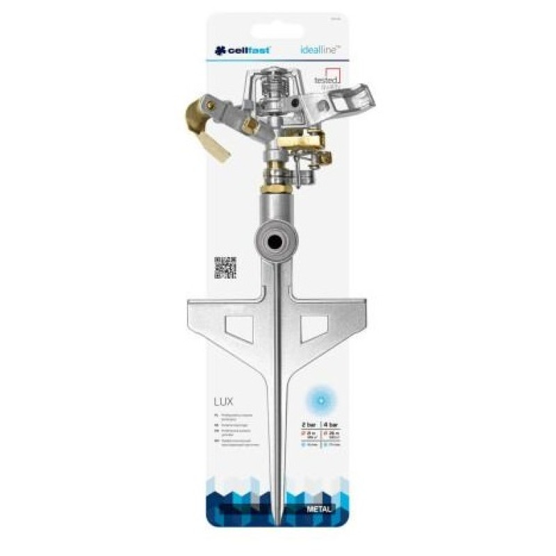 Пульсуючий зрошувач Cellfast LUX, металевий, до 530 м2 52-160. Професійне пульсуюче зрошення люкс ідеального професійного металевого пульсуючого зрошення, зробленого на основі штифта, максимальна стабільність під час поступового поступового сектору по зрошеннях з 20 ° до 360 Поверхня зрошення становить до 530 м2. Можливість підключення до системи великої кількості зрошувачів.