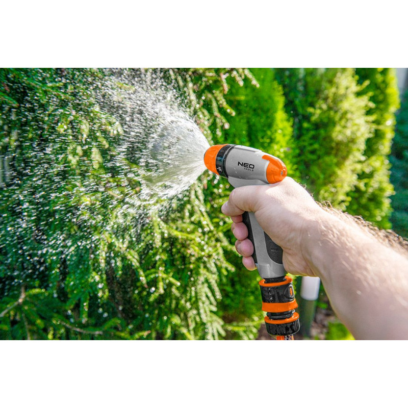 Зрошувач пістолетний, 15-705, NEO, призначений для поливу газонів, садів та сільськогосподарських ділянок. Зручний ручний зрошувач. Має ергономічну ручку, що полегшує використання. Включає 3 функції поливу відповідно до ваших потреб. Він також має ручку для регулювання витрати води.