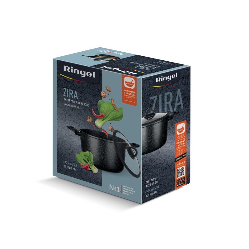 Кришка каструлі Ringel виконана з міцного та стійкого до високих температур скла, завдяки чому можна спостерігати за приготуванням їжі, не знімаючи кришки з каструлі. Крім того, додаткову зручність забезпечується наявністю в кришці клапана для виходу пари.