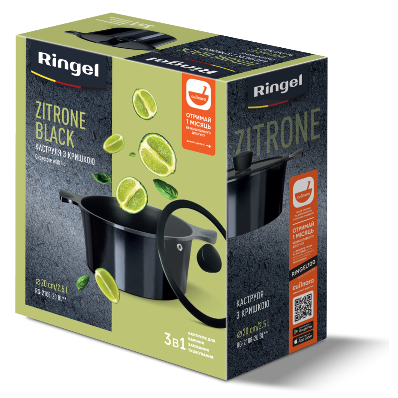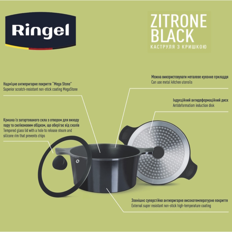 Каструля з литого алюмінію серії Zitrone від Ringel відрізняється товстостінною конструкцією та надійним антипригарним покриттям, завдяки чому цей вид посуду є максимально універсальним рішенням для приготування безлічі видів страв.