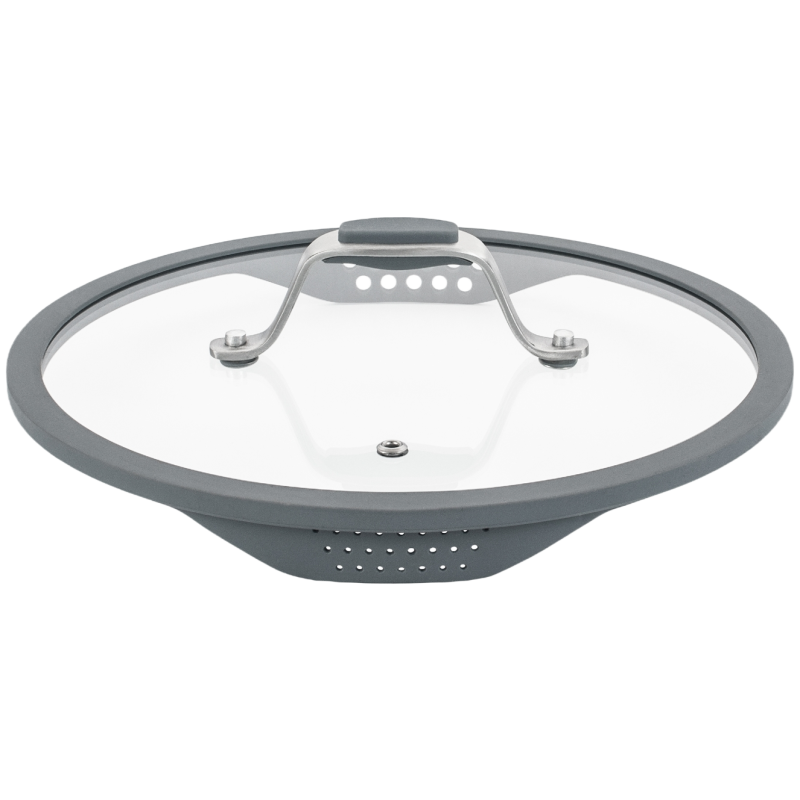 - Кришка з термостійкого скла із силіконовим обідком і перфорацією на обідку для різного типу зливу рідини