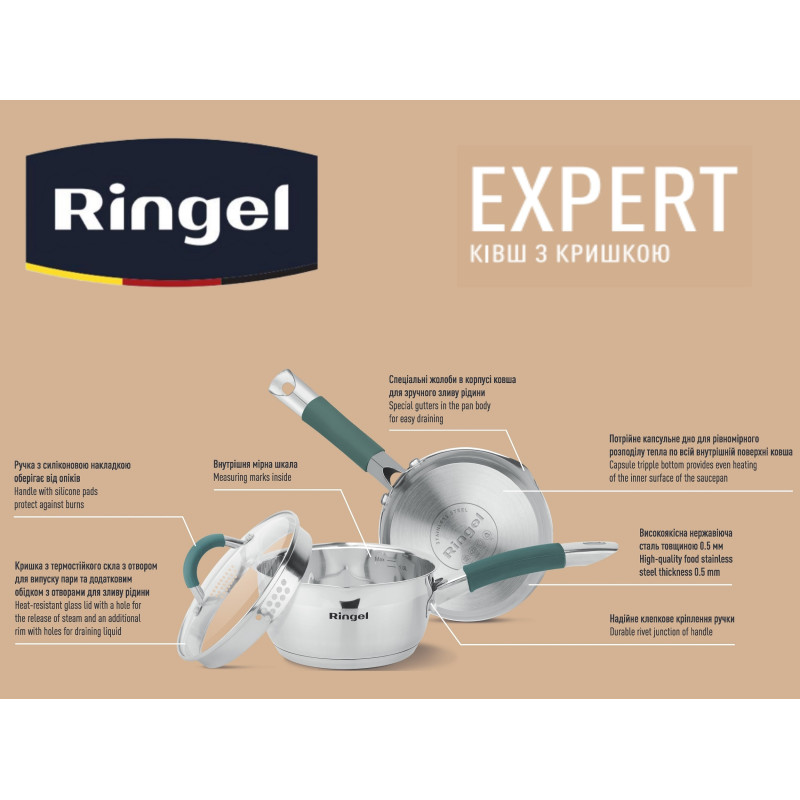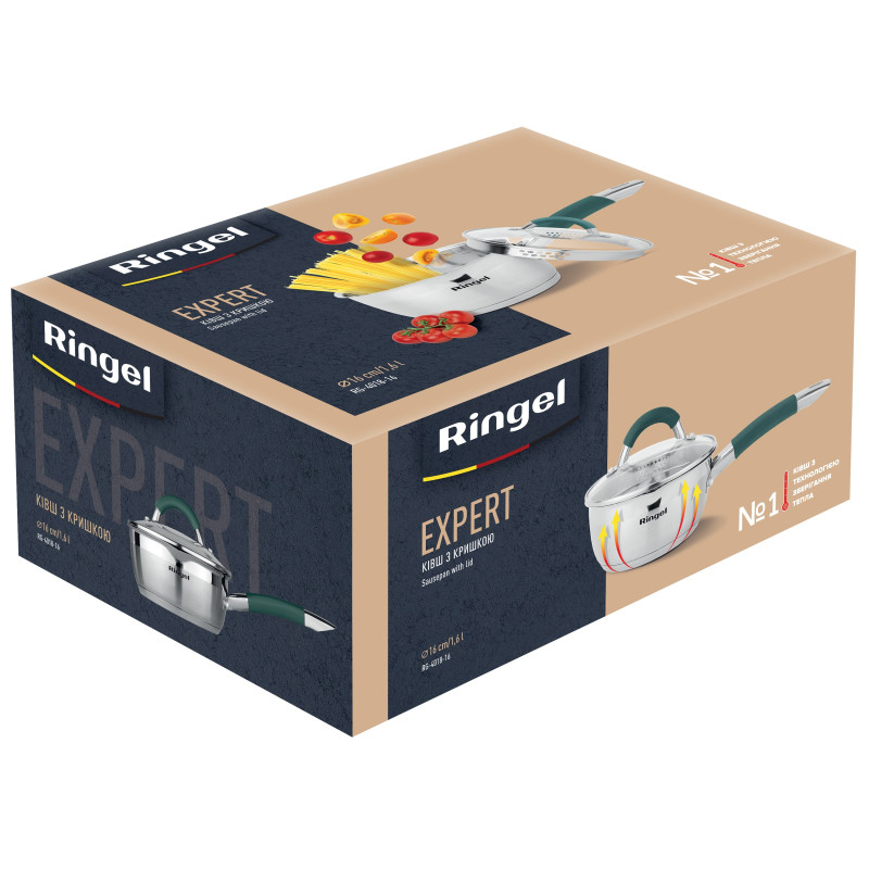 Каструля серії EXPERT від Ringel дозволить будь-якій господині легко та із задоволенням приготувати улюблені страви, підігріти швидко воду. Каструля серії EXPERT має європейський (RoHS, LFGB), американський (FDA) сертифікати якості, що підтверджує безпеку для здоров'я покупців. Готувати з каструлею Ringel можна на будь-яких типах поверхнях включаючи індукційну.
