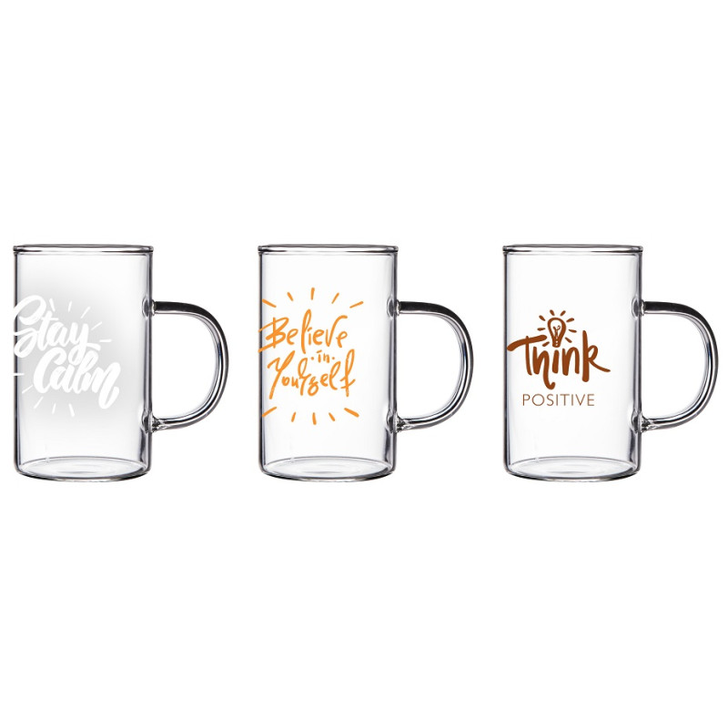 Набір чашок 3 шт HEREVIN POSITIVE PRINT 0.2 л виготовлений з якісного скла, безпечного для здоров'я. Чашки ідеально підходять як для гарячих, так і для холодних напоїв, таких як чай, кава, сік, вода або коктейлі.