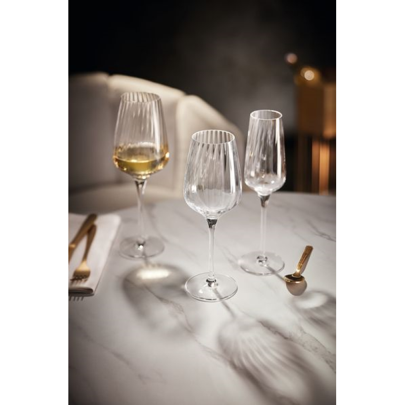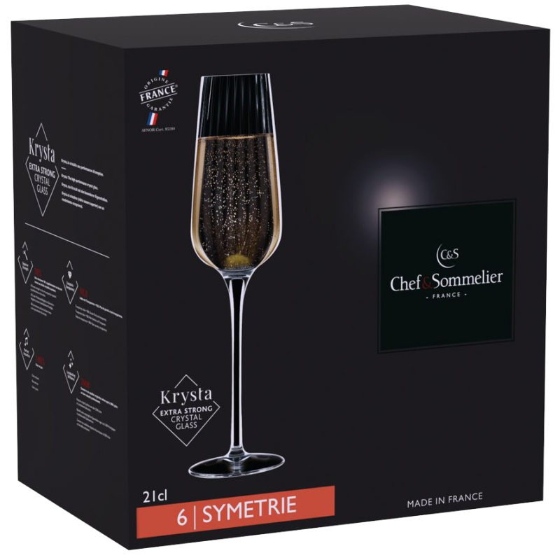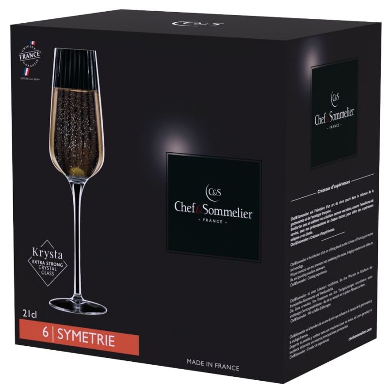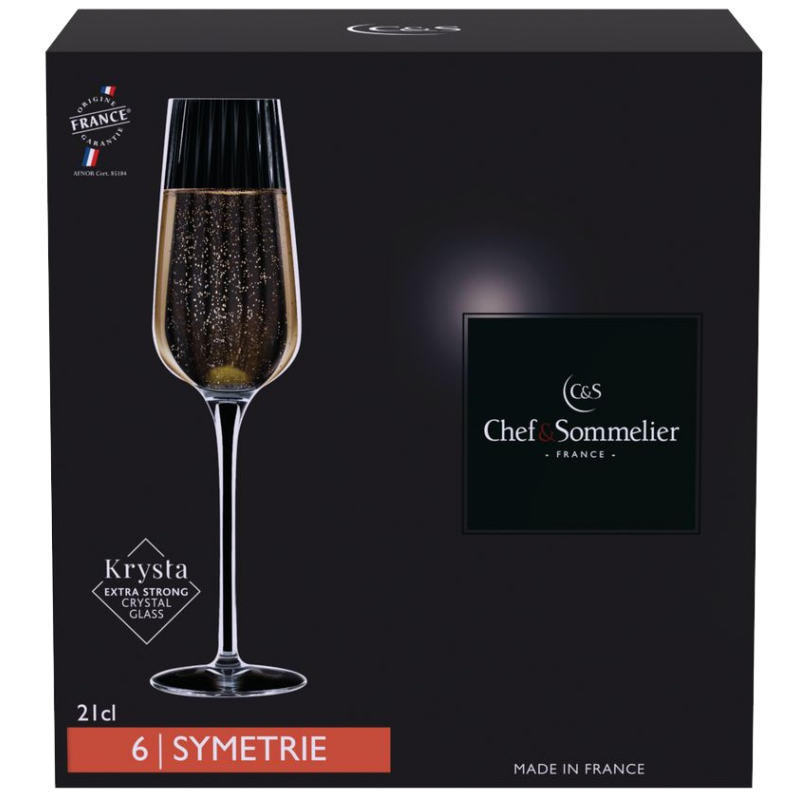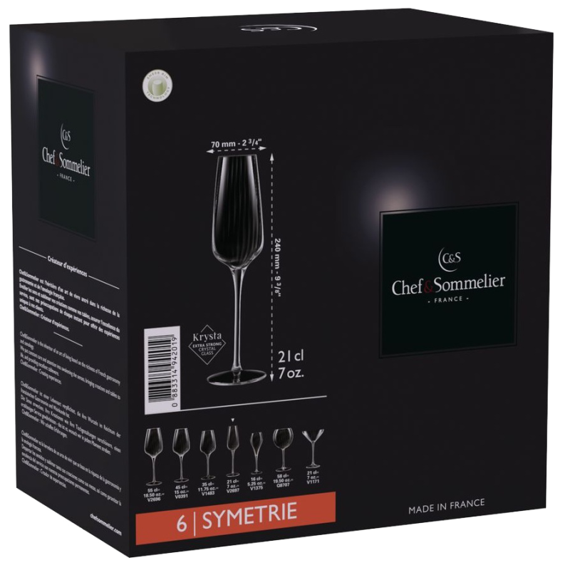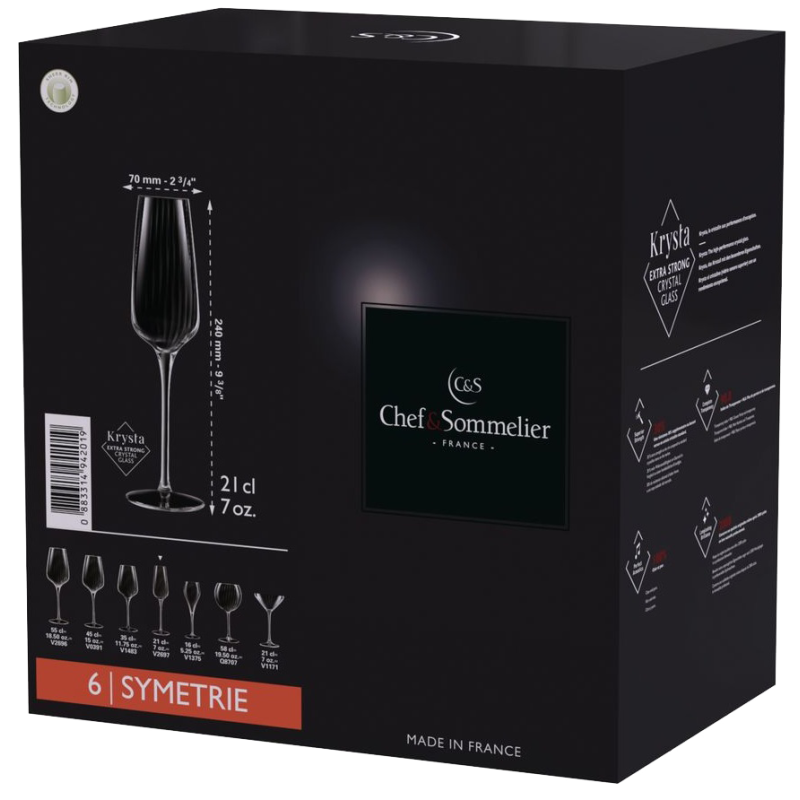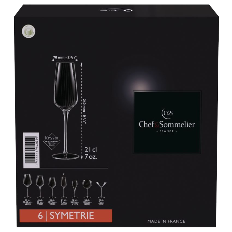 Серія Symétrie – це новий вид колекції від Chef&Sommelier. Ця лінія з широким асортиментом продукції відповідає потребам рестораторів, барменів і просто поціновувачів незвичного та естетичного. Особливістю цієї колекції є вертикальні лінії, що проходять уздовж келихів, створюючи гіпнотичний оптичний ефект.