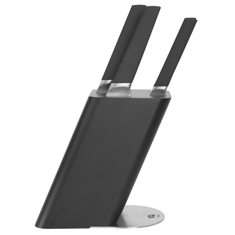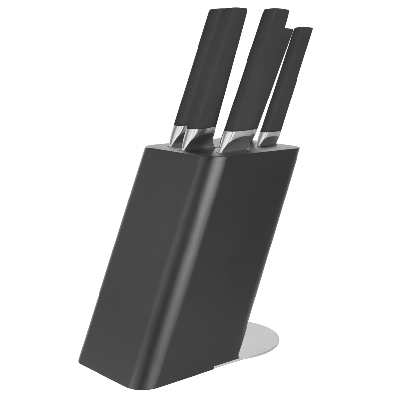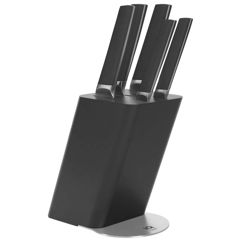 - У набір входить колода для зберігання з каучукового дерева з основою з нержавіючої сталі, що додає стійкості й елегантності