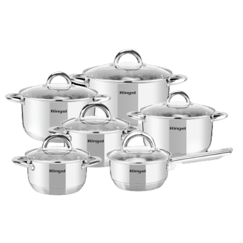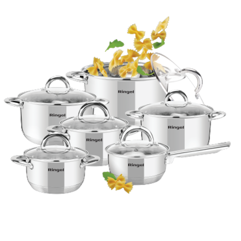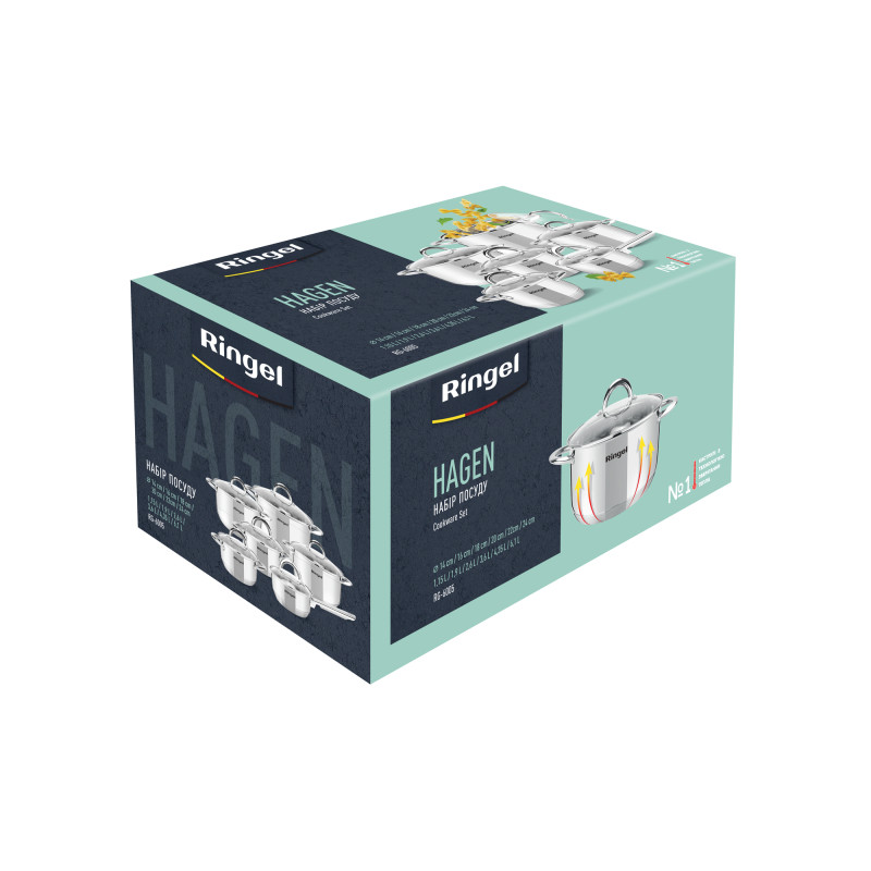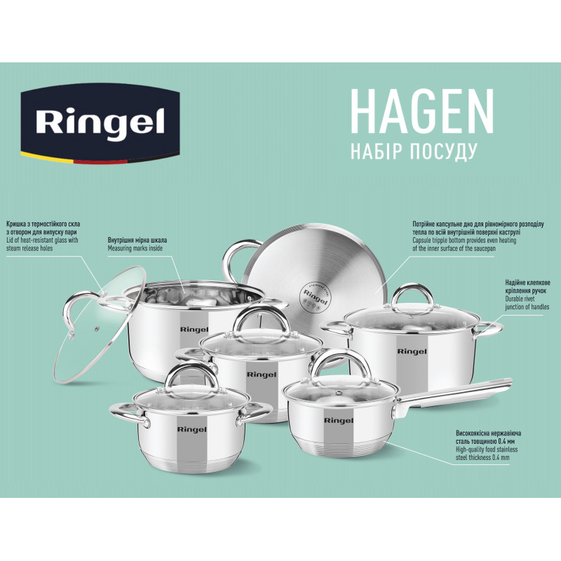 Набір посуду RINGEL Hagen найбільший набір для кухні в асортименті. У нього входить ківш 1,15 л, каструлі 1,9 л, 2,6 л, 3,6 л, 4,35 л і 6,1л.